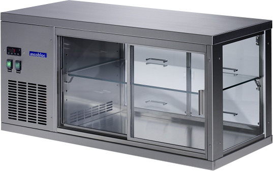 3 seitig verglaste Aufsatzvitrine. Die bedienerseitigen Schiebescheiben bestehen aus 14 mm, die restlichen Scheiben aus 17 mm starkem Isolierglas. Griffe der Schiebescheiben aus CNS. Thermostat mit digitaler Temperaturanzeige für eine optimale Temperatureinstellung, Beleuchtung in der Gerätedecke (separat schaltbar).