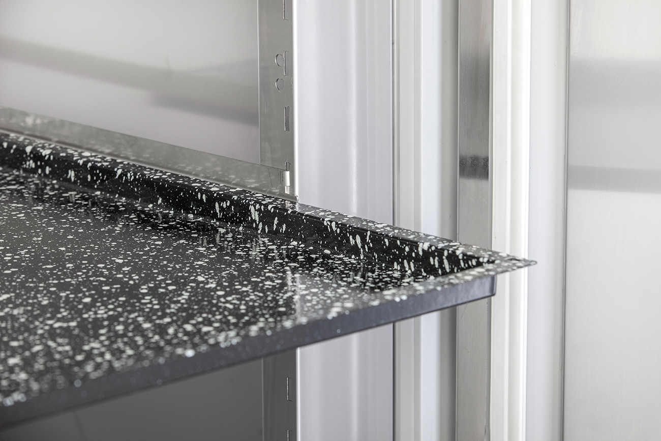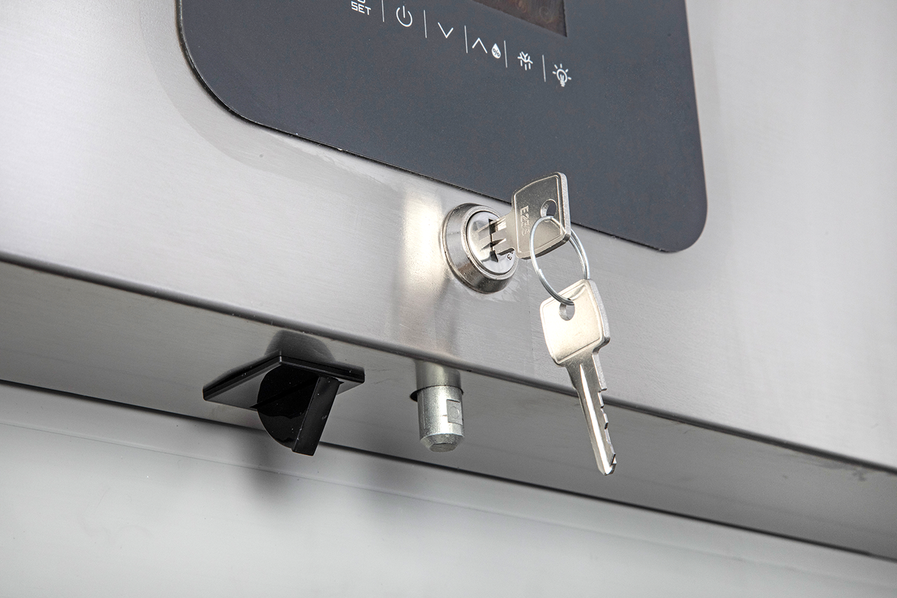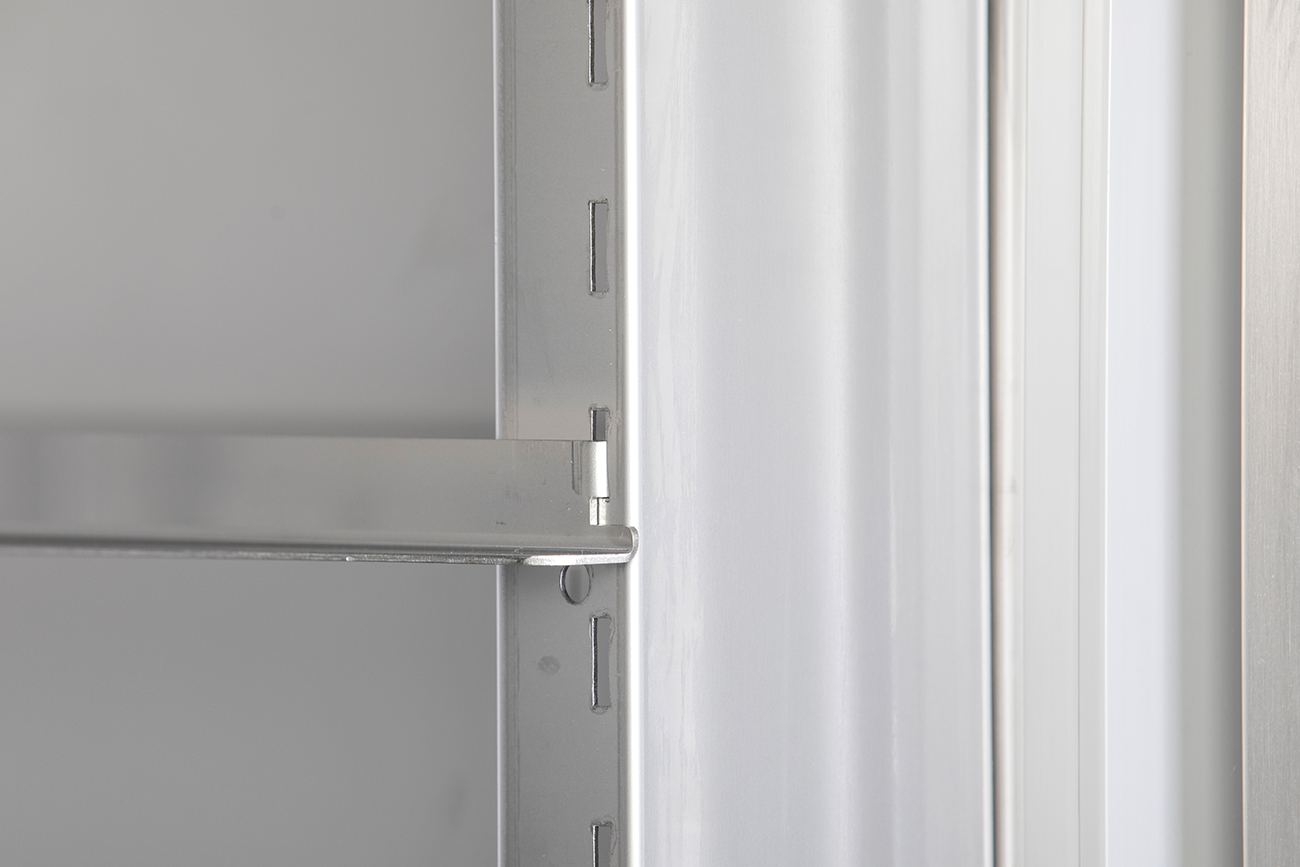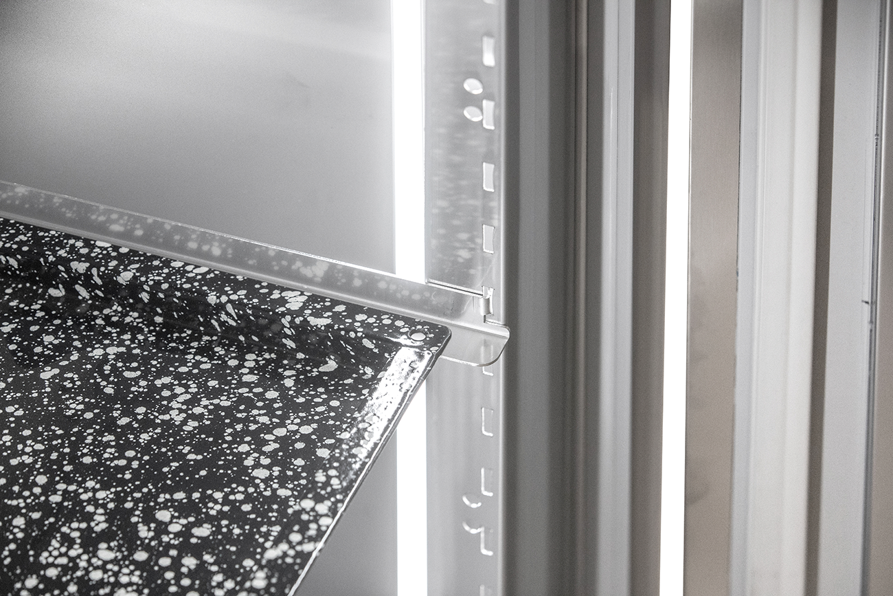 Zusätzliche Vorteile umfassen eine vertikale LED-Innenbeleuchtung für eine optimale Sicht auf die gelagerten Produkte und vier höhenverstellbare CNS-Füße (90 bis 125 mm), die Bodenunebenheiten mühelos ausgleichen.