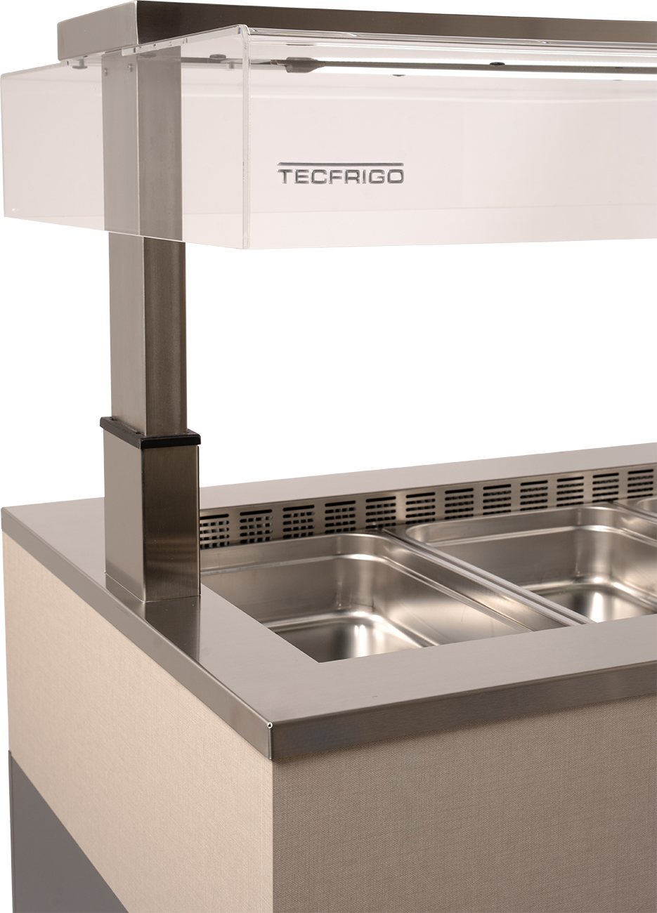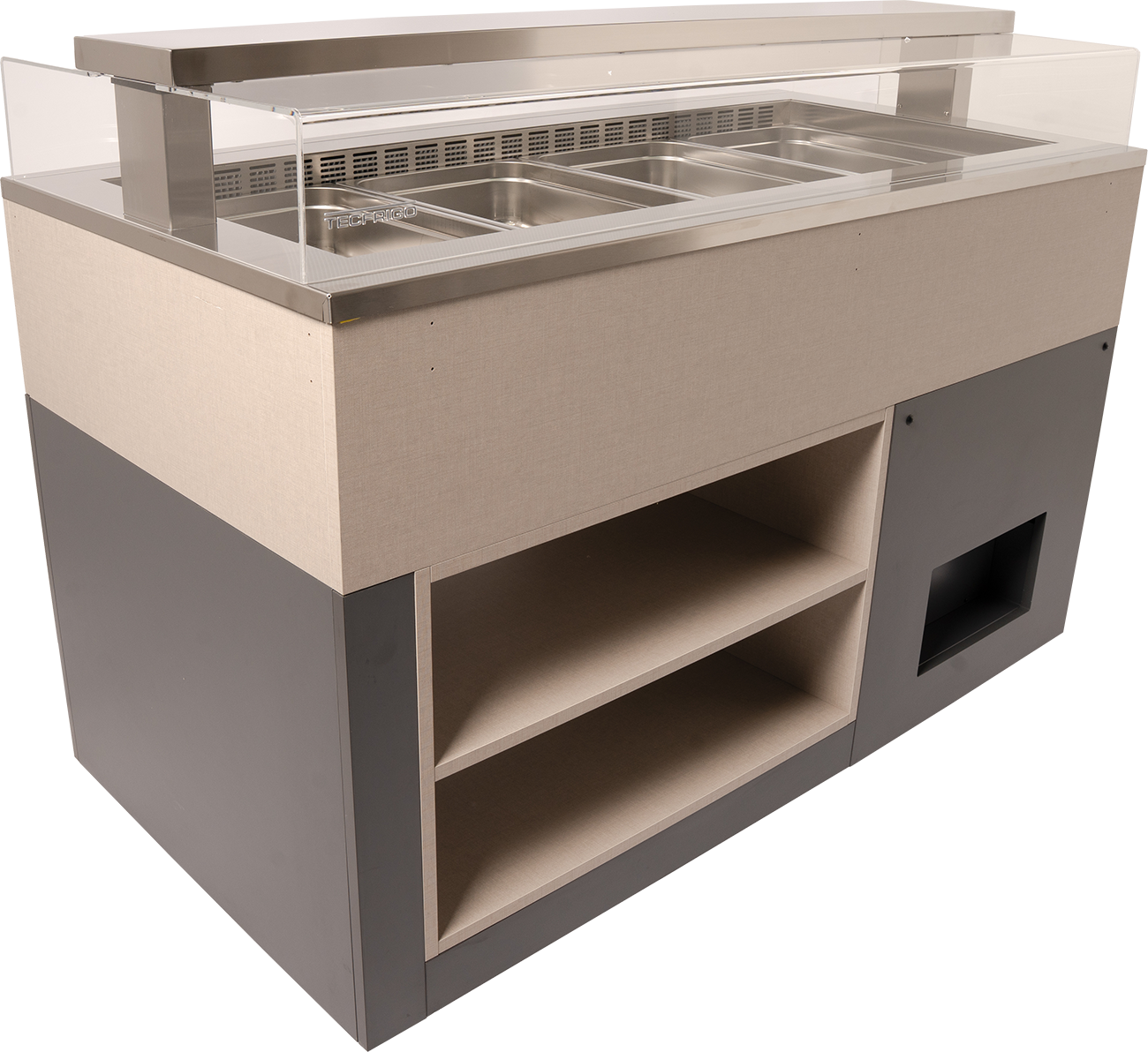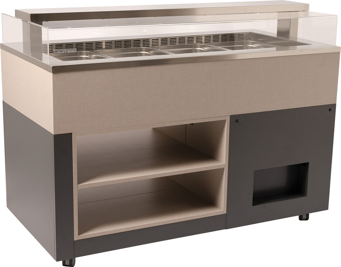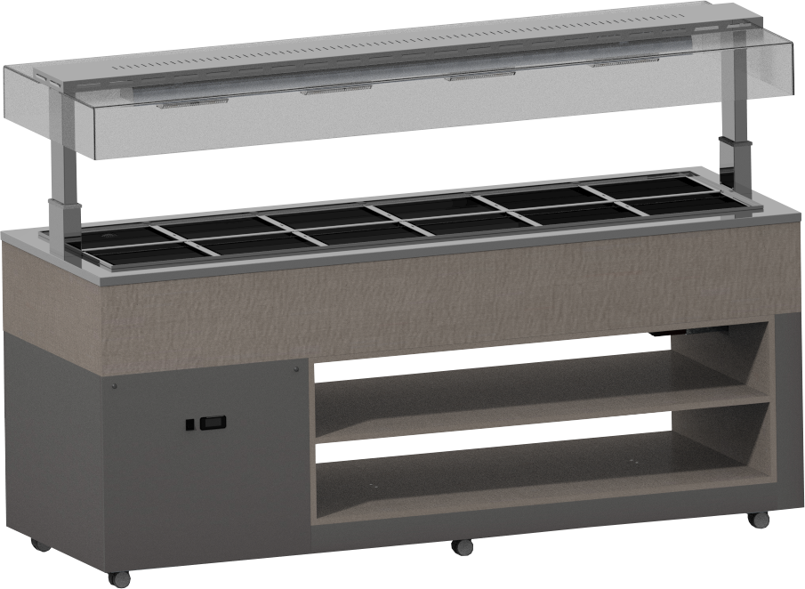 Die Außenverkleidung in laminierter Holzoptik (graphitgrau / Tokyo Fabric) sorgt für eine elegante, zeitgemäße Optik und fügt sich harmonisch in anspruchsvolle Buffetlandschaften ein. Im Inneren gewährleisten Wannen aus Edelstahl AISI 304 höchste Hygienestandards, Korrosionsbeständigkeit und eine lange Lebensdauer.