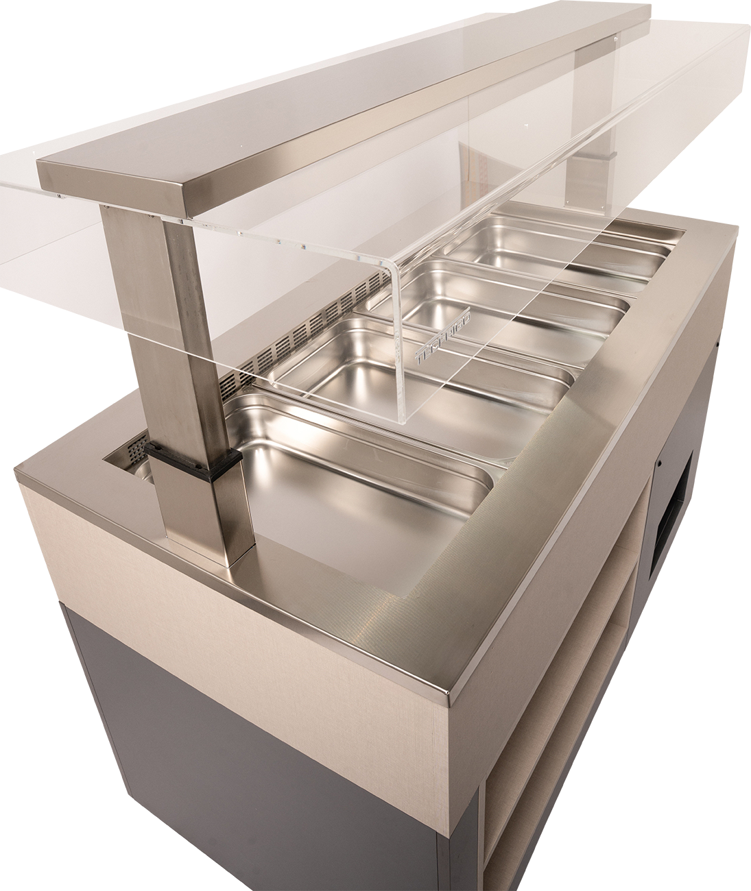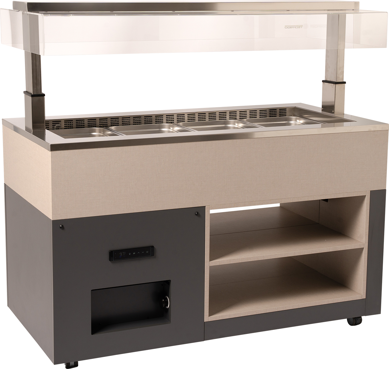 Für zusätzliche Flexibilität verfügt die Bain-Marie über eine manuelle Wasserbefüllung sowie einen Wasserablaufhahn, wobei die Wasserentsorgung bauseits erfolgt. Ein besonderes Highlight ist der höhenverstellbare, elektrisch betriebene Plexiglas-Hustenschutz, der separat schaltbar ist und höchste Hygiene im Gästebereich unterstützt. Ergänzt wird das System durch eine integrierte Infrarot-Wärmelampe, die die Speisen auch von oben optimal temperiert.