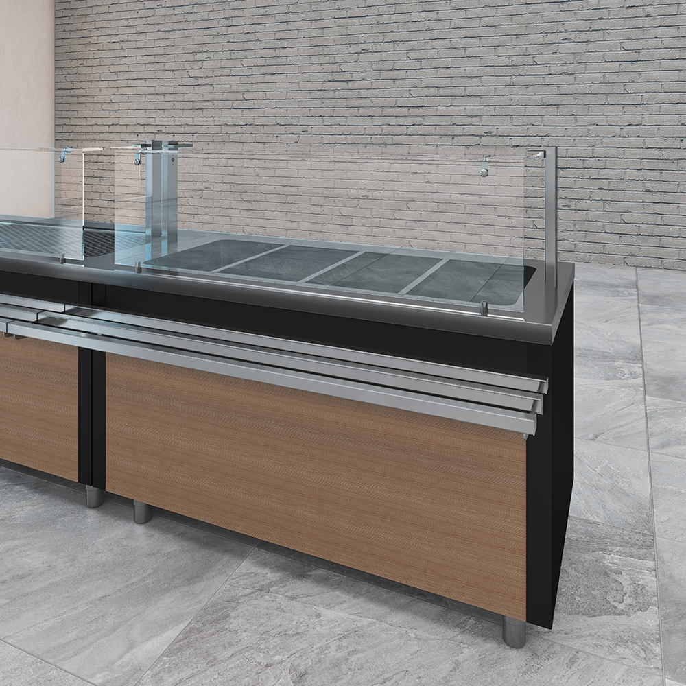 Dank vier attraktiver Designoptionen – Edelstahl, lackiertes Edelstahl, Holz-Finish oder individuelle Klebefolien – lässt sich das Gerät optimal an jedes Gastronomiekonzept anpassen. Damit eignet sich das System ideal für moderne Buffetlösungen, Free-Flow-Konzepte und professionelle Speisenausgaben im Objektgeschäft.