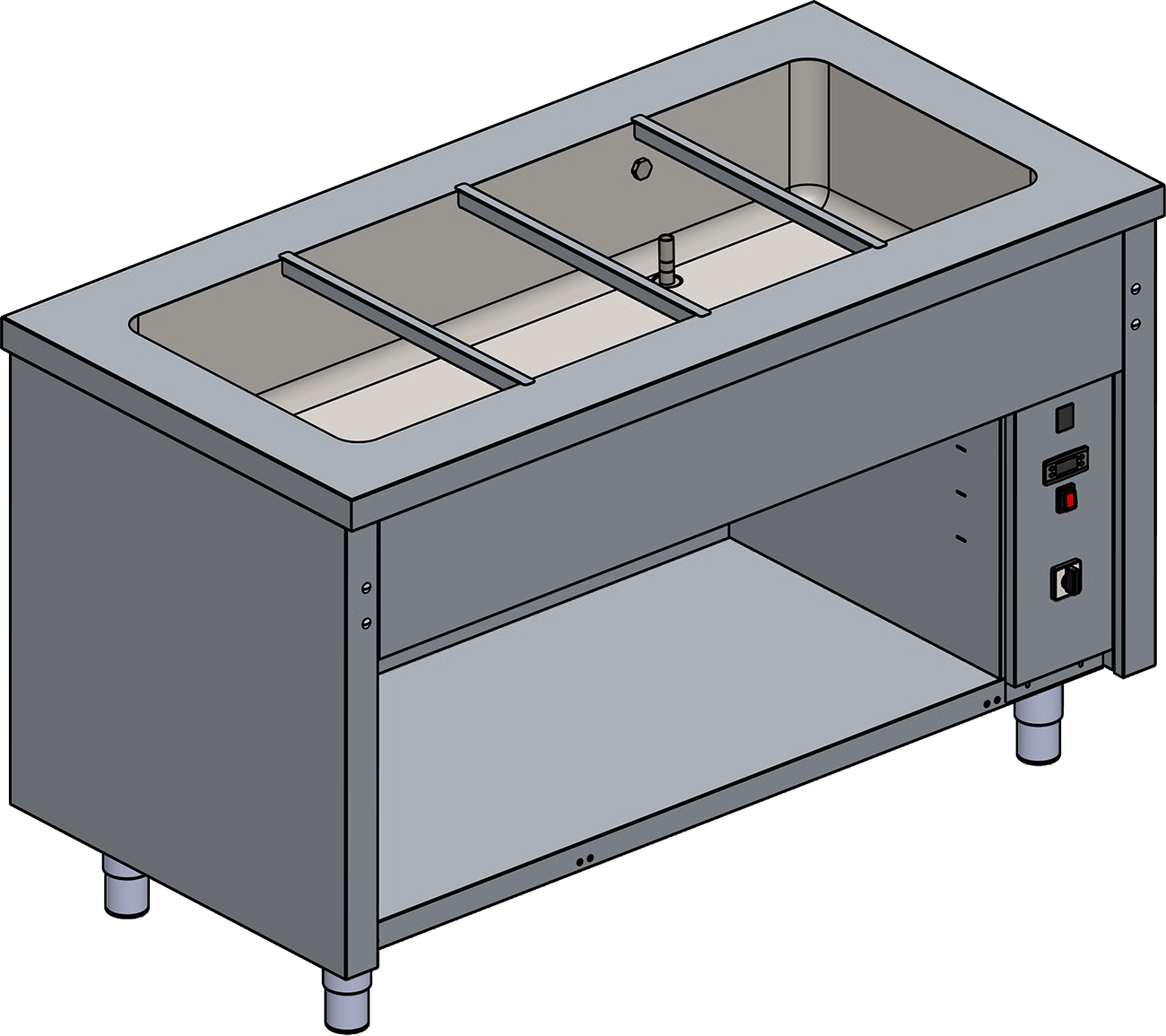 Der stabile Unterbau verfügt über ein offenes, bedienerseitiges Schrankfach zur praktischen Aufbewahrung sowie robuste Edelstahlfüße für sicheren Stand. Optional sind Räder für flexible Einzelaufstellung oder beheizte Unterbauten erhältlich.
