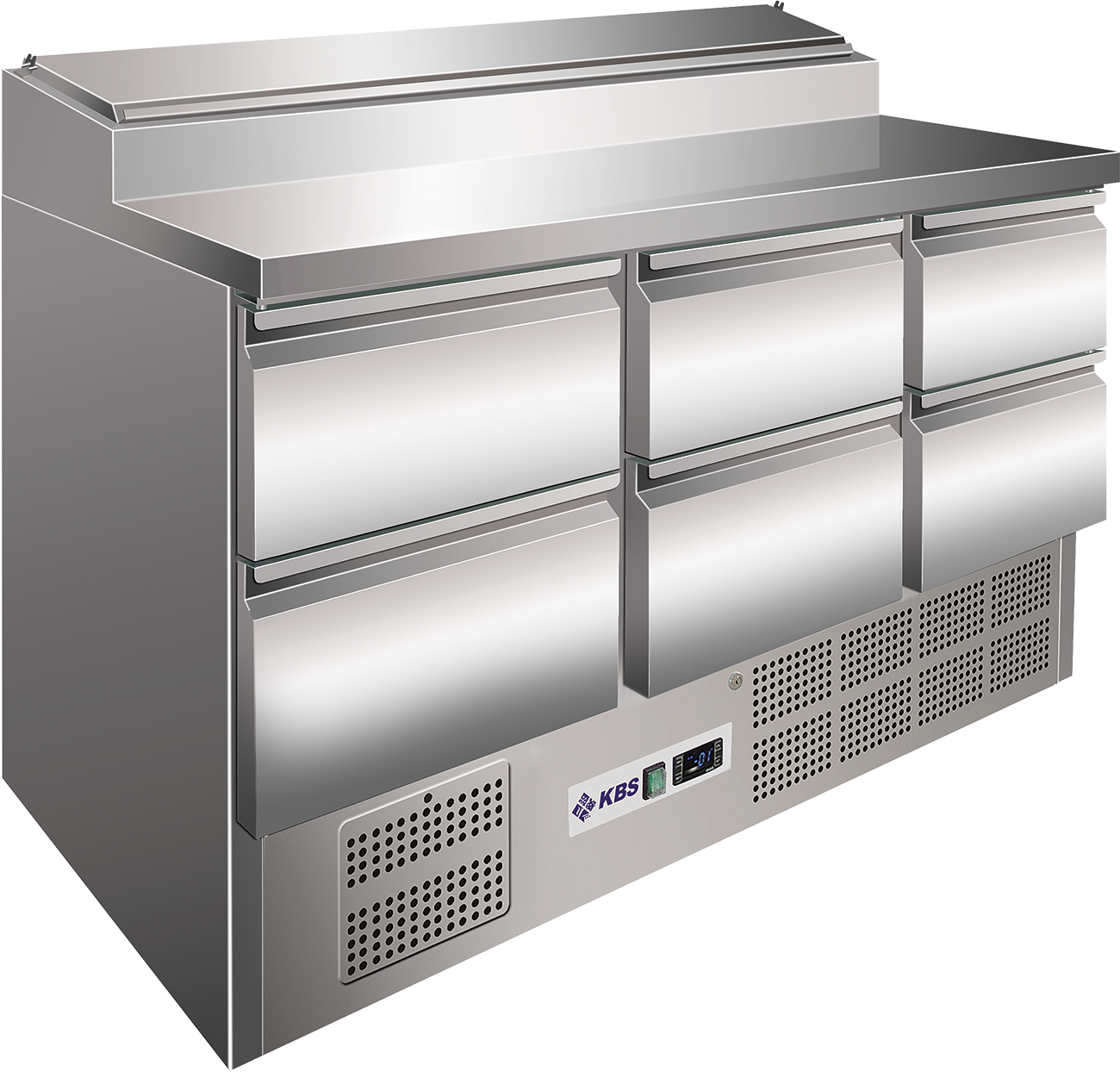 Belegstation mit 6 Schubladen und 3-seitig eingeschäumtem Verdampfer, Temperatur mittels elektronischem Thermostat regelbar und digitale Temperaturanzeige. Beleuchteter Ein-/Ausschalter. Der Fettfilter befindet sich hinter der abschließbaren Maschinenblende, ist leicht herausnehmbar und waschbar. Türdichtungen servicefreundlich ohne Werkzeug wechselbar. CNS-Arbeitsfläche 1370 x 456 mm (B x T), Boden als Wanne ausgebildet und konisch zulaufend, mittig Tauwasserablauf. Lieferung ohne GN-Behälter.