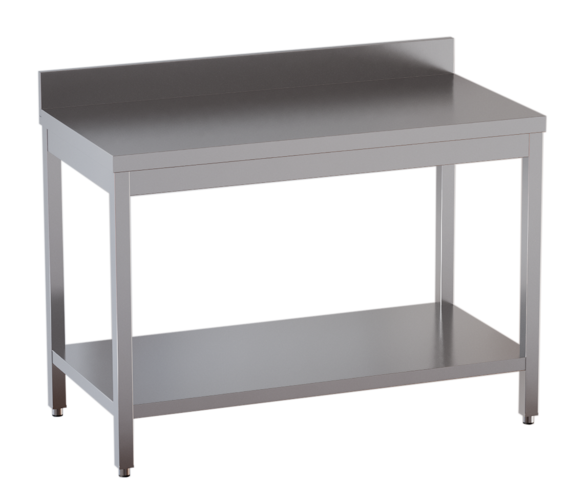 Edelstahl-Arbeitstisch aus AISI 304 in punktgeschweißter Ausführung mit verstärktem Grundboden und einer Arbeitshöhe von 85 cm. Die Arbeitsplatte mit 60 cm Tiefe, einer Aufkantung sowie einem allseitigem Plattenüberstand von 17,5 mm ist komplett aus Edelstahl gefertigt. Mit einer wasserabstoßenden Oberfläche und einer schallgedämmten Unterplattenverstärkung bietet die Arbeitsplatte optimale Hygienefaktoren. Bei einer Arbeitshöhe vom 85 cm verfügt der Edelstahl-Arbeitstisch aus AISI 304 über eine Bodenfreiheit von 155 mm.