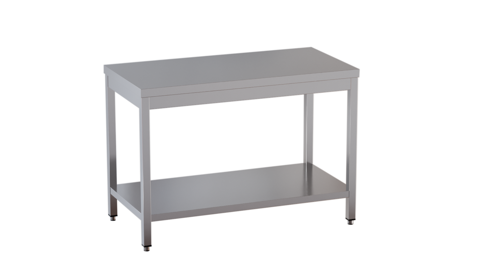Edelstahl-Arbeitstisch aus AISI 304 in punktgeschweißter Ausführung mit verstärktem Grundboden und einer Arbeitshöhe von 85 cm. Die Arbeitsplatte mit 70 cm Tiefe und einem allseitigem Plattenüberstand von 17,5 mm ist komplett aus Edelstahl gefertigt. Mit einer wasserabstoßenden Oberfläche und einer schallgedämmten Unterplattenverstärkung bietet die Arbeitsplatte optimale Hygienefaktoren. Bei einer Arbeitshöhe vom 85 cm verfügt der Edelstahl-Arbeitstisch aus AISI 304 über eine Bodenfreiheit von 155 mm.