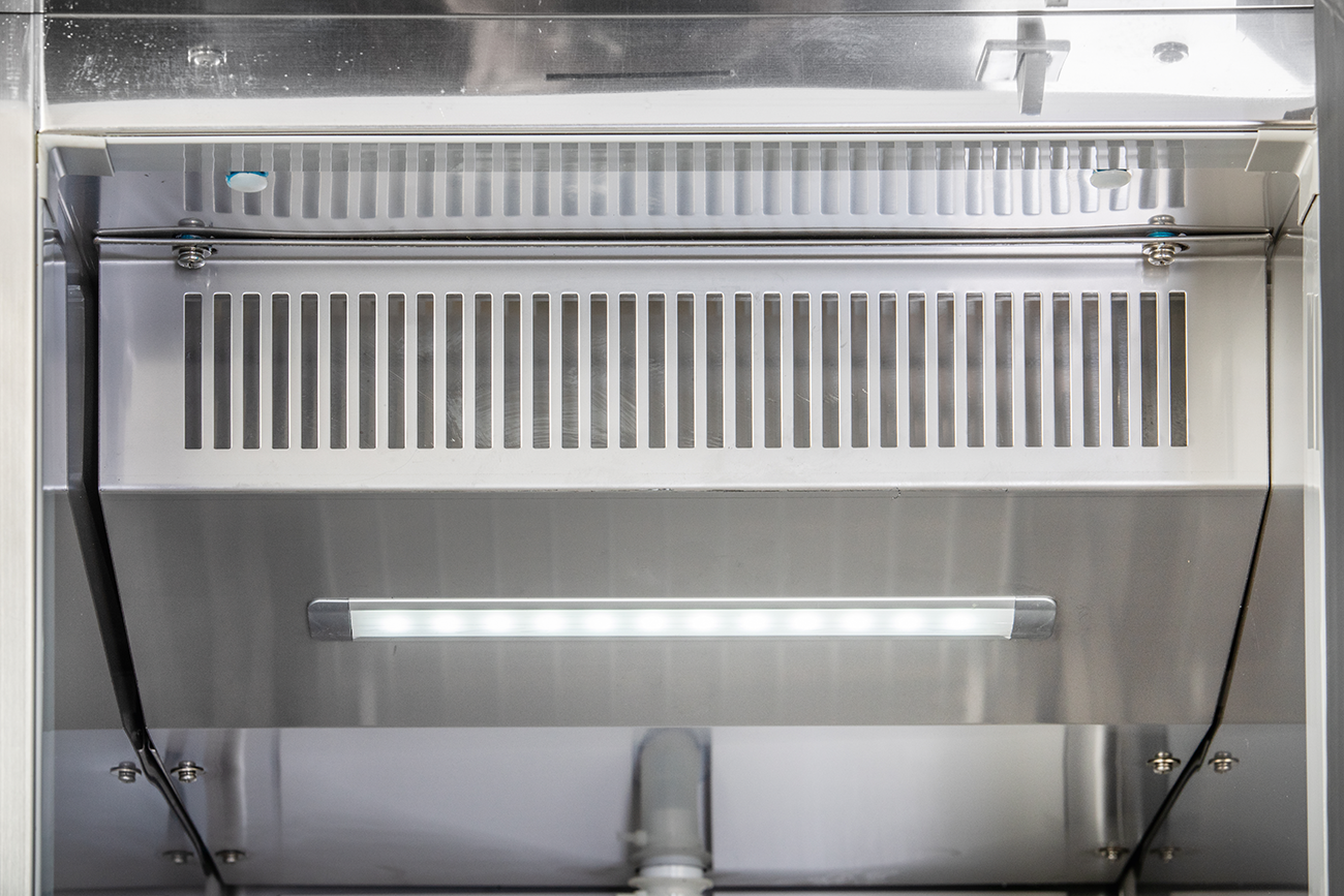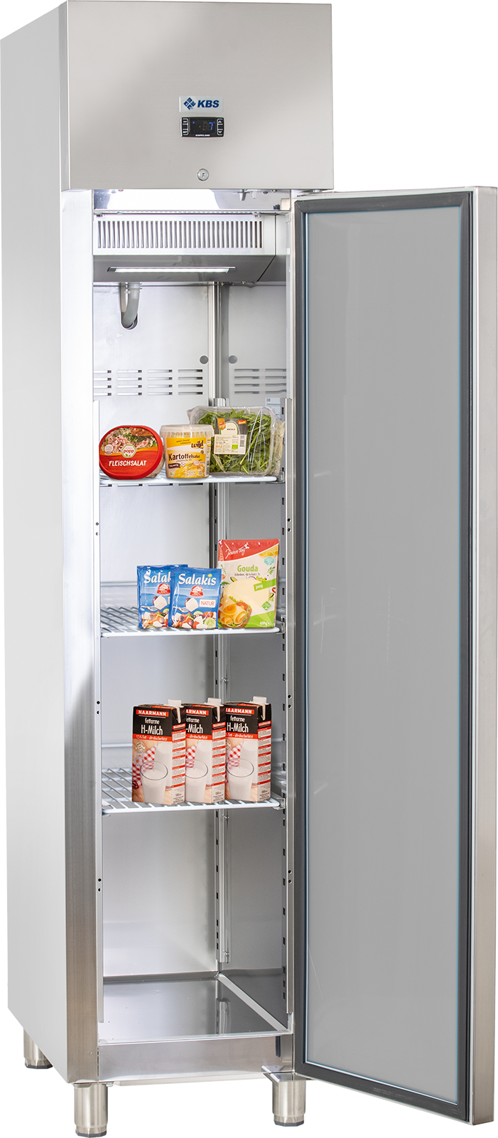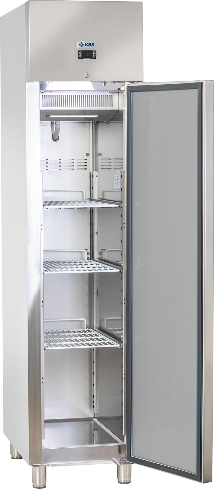 Umluft Edelstahl-Gewerbekühlschank GN 1/1 mit elektronischer Steuerung und digitaler Temperaturanzeige. Anzeige von visueller Alarmanzeige, Anzeige des Kühl- und Abtauvorganges, sowie beleuchteter Ein-/Ausschalter in der Steuerung. Frontblende servicefreundlich klappbar, Kondensator mit Fettfilter, Selbstschließende Türen mit Zylinderschloss. Gesteckte, wechselbare Magnetdichtungen. Tür mit ergonomisch geformter und eingelassener Griffleiste. Automatische Abtauung und energiesparende Heißgas-Tauwasserverdunstung. Boden im Innenraum gerundet für bessere hygienische Reinigung. Boden als Wanne ausgebildet. Der große Innenraum ermöglicht das Einbringen von insgesamt 11 GN 1/1 Roste im Längseinschub. 4 höhenverstellbare CNS Ausgleichsfüße um Bodenunebenheiten vor Ort auszugleichen.