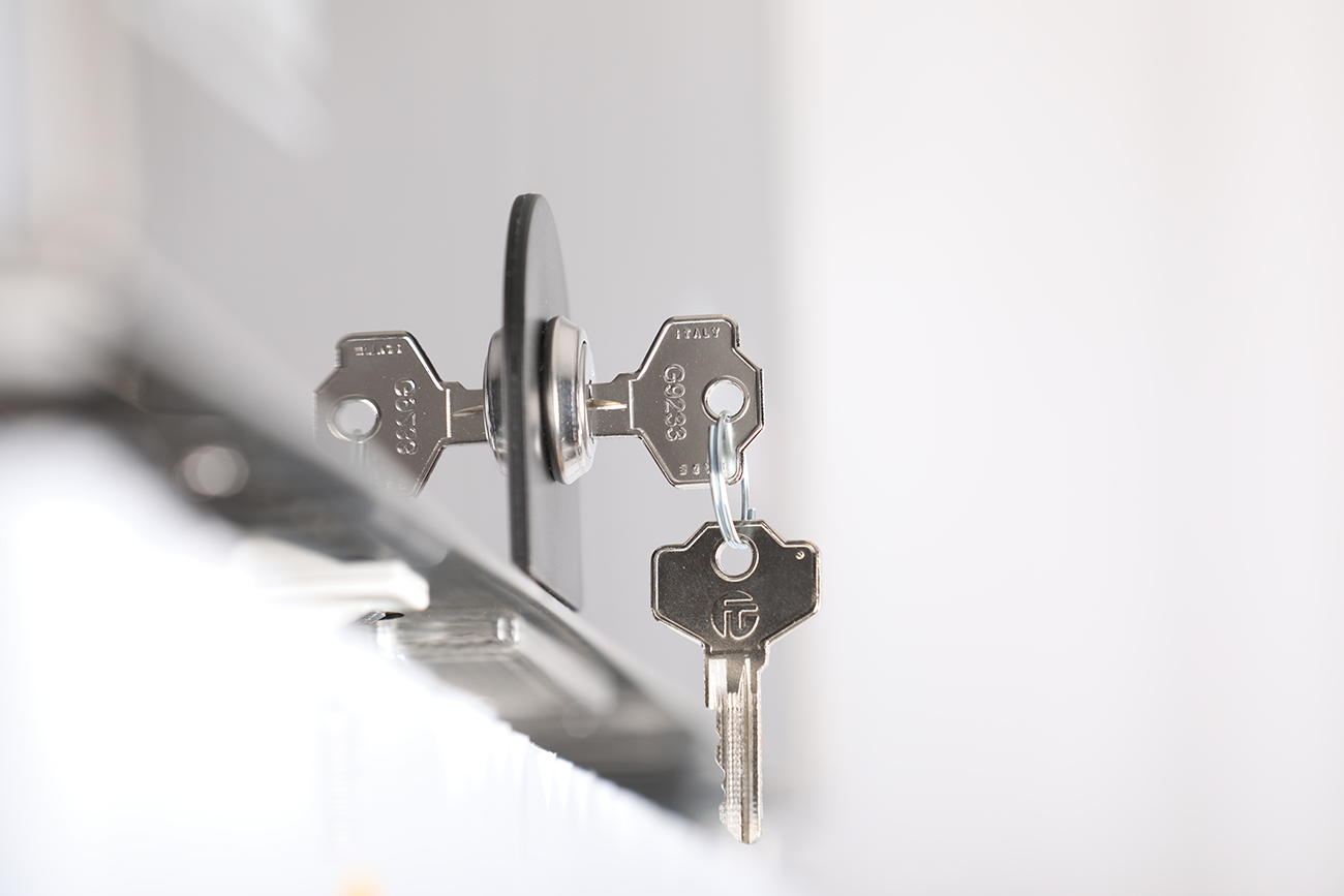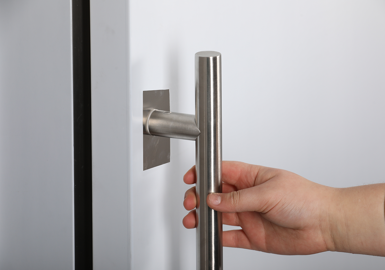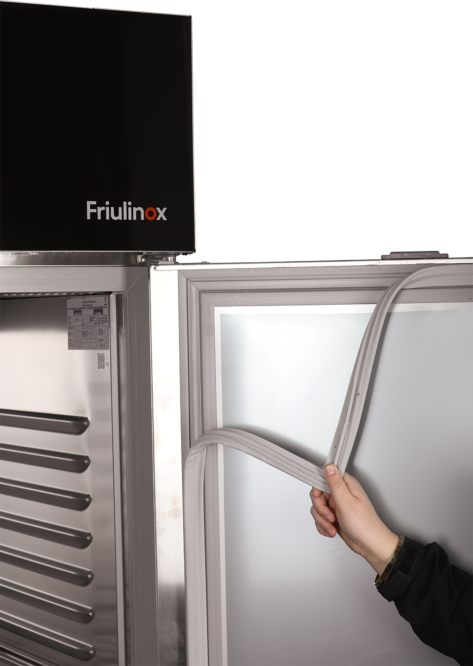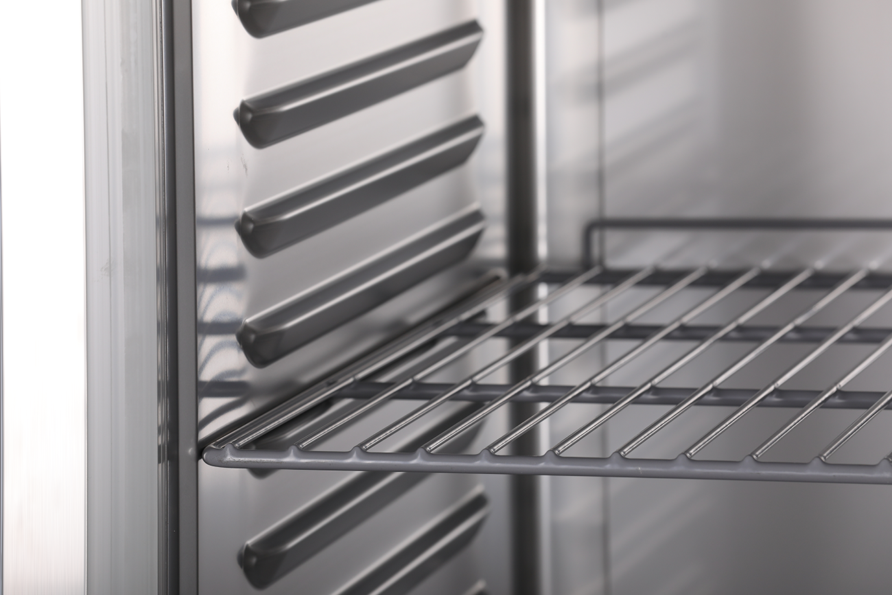Innenraum mit vorgeformten Auflageschienen zur Einbringung von maximal 24 Rosten GN 2/1 in einem Abstand von 55 mm. Tiefgezogener Innenboden mit abgerundeten Ecken als Wanne ausgebildet für maximale Hygiene. Tür mit Schloss und aufgesetzter Griffleiste unter 100° selbstschließend mit oberen Schleppscharnier. Unteres Türscharnier nach vorne montiert, hierdurch kann der Gewerbe-Tiefkühlschrank für eine Sockelbaumontage verwendet werden.