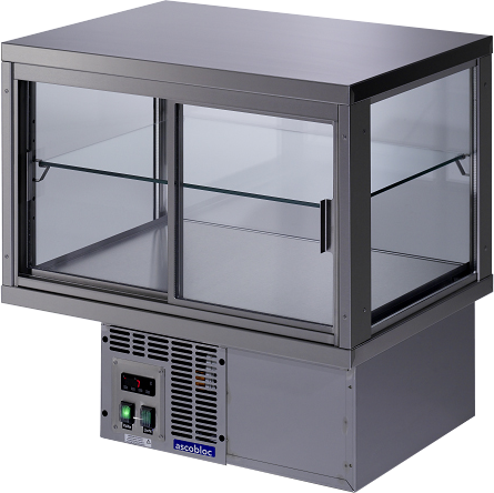 4 seitig verglaste Einbauvitrine. Die bedienerseitigen Schiebescheiben bestehen aus 14 mm, die restlichen Scheiben aus 17 mm starkem Isolierglas. Griffe der Schiebescheiben aus CNS. Thermostat mit digitaler Temperaturanzeige für eine optimale Temperatureinstellung, Beleuchtung in der Gerätedecke (seperat schaltbar). Zum Einbau in eine Arbeitsplatte ist ein Ausschnitt von 600 x 560 mm vorzusehen. Sollte der Unterbau geschlossen sein, ist je eine Lufteintritts-und Luftaustrittsöffnung von min. 350 cm² vorzusehen. Die Bedienelemente können aus dem Maschienenfach herausgeschraubt und bis zu 50 cm entfernt in den Schrankkorpus eingebaut werden. Der dafür benötigte Auschnitt muss B:100 mm und H 120 mm betragen.