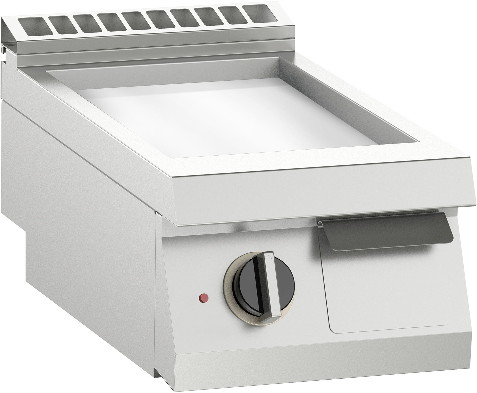 Elektro-Grillplatte mit 1 Heizzone 5,4 KW 400 V Anschlußfertig. Grillplatte aus Edelstahl AISI 430 gerillt mit Fett-Auffangschale und thermostatische Temperaturregelung. Lieferung erfolgt inkl. Schaber.