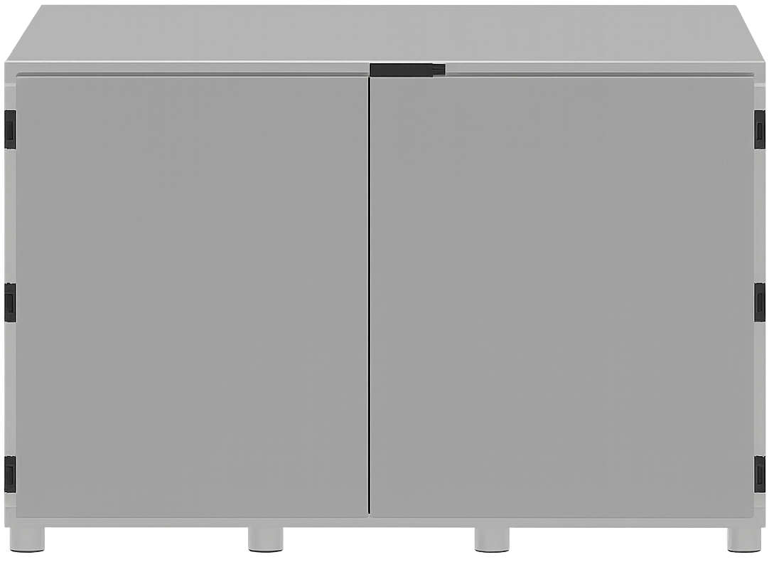 Fasskühlerkorpus aus deutscher Fertigung für die Aufnahme von 10 KEG Fässern je 50 Liter mit einem Durchmesser von 425 mm. Der Korpus mit einer Isolierstärke von 50 mm wird zerlegt angeliefert. Einfache Montage durch innenliegende Spannverschlüsse. Korpusdecke mit perforiertem Durchbruch von 80 mm für die Durchführung von Bier- oder Pytonleitung und Ausschnitt für Deckenkälteaggregat. Boden für höchste Beanspruchung aus Edelstahl 1.4301, Seiten, Decke und Innenrückwand aus ALU Zink gefertigt. Die Türen sind mit servicefreundlichen Hohlkammersteckdichtungen und Kantenschluss ausgerüstet. Bodenunebenheiten können durch die verstellbaren Füße Stellbereich 25 mm ausgeglichen werden. Lieferung erfolgt ohne Kühlaggregat.