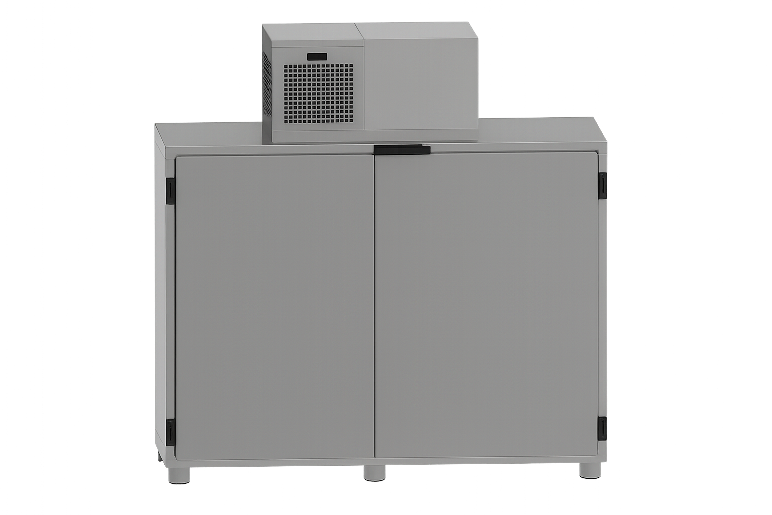 Fasskühlerkorpus aus deutscher Fertigung für die Aufnahme von 3 KEG Fässern je 50 Liter mit einem Durchmesser von 425 mm. Der Korpus mit einer Isolierstärke von 50 mm wird zerlegt angeliefert. Einfache Montage durch innenliegende Spannverschlüsse. Korpusdecke mit perforiertem Durchbruch von 80 mm für die Durchführung von Bier- oder Pytonleitung und Ausschnitt für Deckenkälteaggregat. Boden für höchste Beanspruchung aus Edelstahl 1.4301, Seiten, Decke und Innenrückwand aus ALU Zink gefertigt. Die Türen sind mit servicefreundlichen Hohlkammersteckdichtungen und Kantenschluss ausgerüstet. Bodenunebenheiten können durch die verstellbaren Füße Stellbereich 25 mm ausgeglichen werden. Lieferung erfolgt ohne Kühlaggregat.