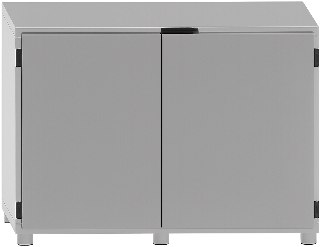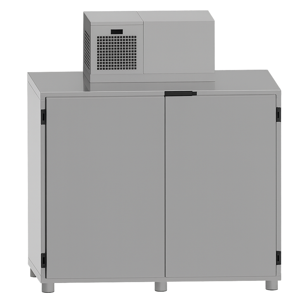 Fasskühlerkorpus aus deutscher Fertigung für die Aufnahme von 4 KEG Fässern je 50 Liter mit einem Durchmesser von 425 mm. Der Korpus mit einer Isolierstärke von 50 mm wird zerlegt angeliefert. Einfache Montage durch innenliegende Spannverschlüsse. Korpusdecke mit perforiertem Durchbruch von 80 mm für die Durchführung von Bier- oder Pytonleitung und Ausschnitt für Deckenkälteaggregat. Boden für höchste Beanspruchung aus Edelstahl 1.4301, Seiten, Decke und Innenrückwand aus ALU Zink gefertigt. Die Türen sind mit servicefreundlichen Hohlkammersteckdichtungen und Kantenschluss ausgerüstet. Bodenunebenheiten können durch die verstellbaren Füße Stellbereich 25 mm ausgeglichen werden. Lieferung erfolgt ohne Kühlaggregat.