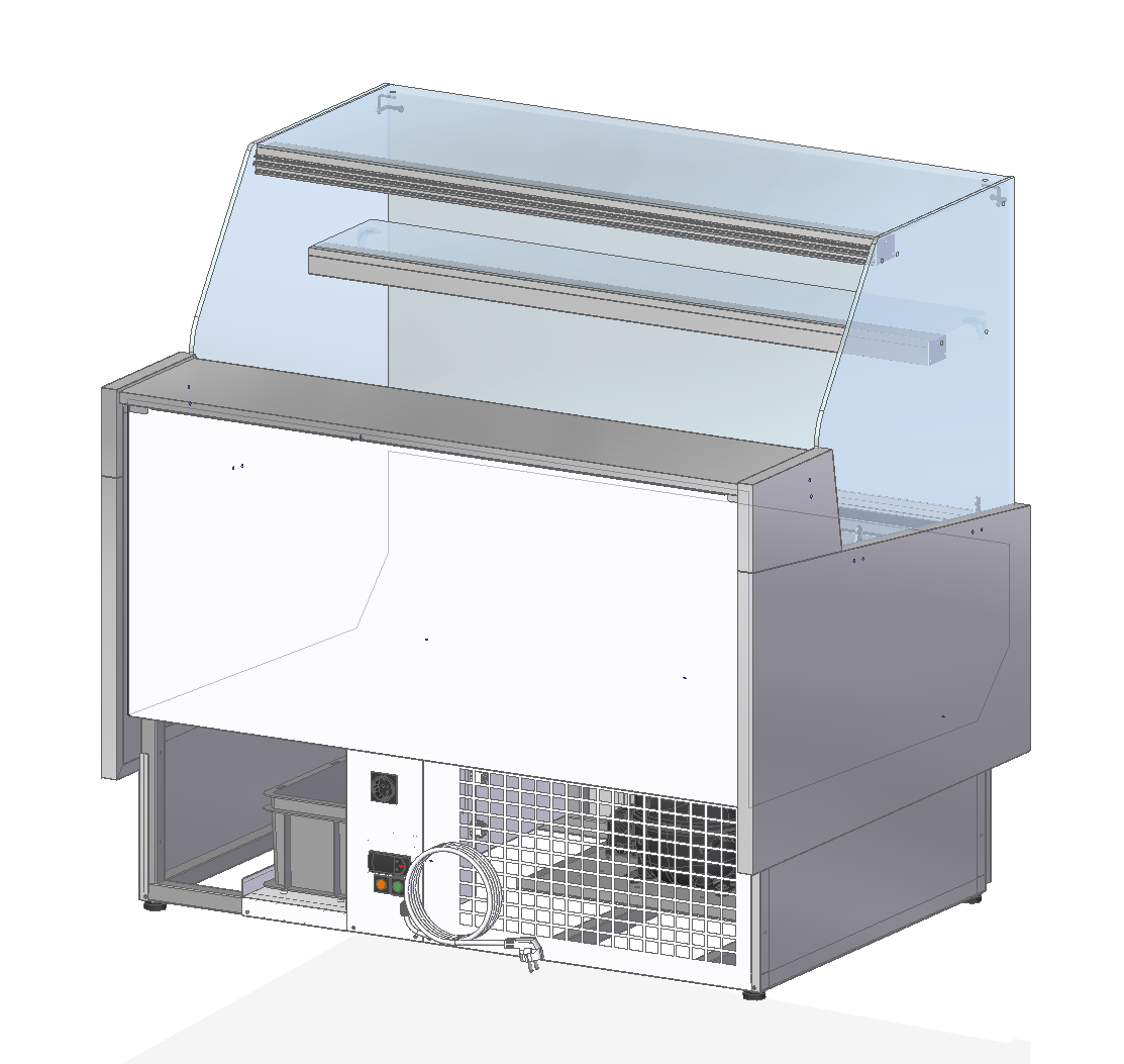 Fischtheke mit geraden Glasaufbau, stiller Kühlung und berohrter Wanne mit hochwertigen beschichteten Verdampfer. Die Fischtheke verfügt über eine elektronische Steuerung mit digitaler Temperaturanzeige und einer automatischen Abtauung. Der gerade Glasaufbau ist bei Lieferung vormontiert und mit einer 200 mm tiefen ungekühlten Zwischenglasablage ausgestattet. Optimal wird die Fischtheke und die präsentierte Ware über die vorhandene LED Leuchte mit einer Farbtemperatur von 4000 K (Kelvin) ausgeleuchtet. Die Front-, Seitenwände und die Arbeitsplatte sind aus Edelstahl gefertigt. Mit einer Tiefe von 250 mm bietet die Arbeitsplatte ausreichend Platz. Die zusätzlich gekühlte (berohrte) Ausstellungsfläche ist aus Edelstahl (CNS AISI 316) gefertigt und hoch korrosionsbeständig. Mit einer Tiefe von 595 mm und einer Höhe von 65 mm ist die Ausstellungsfläche als Wanne geformt, um diese mit Scherbeneis oder Flockeneis zu befüllen. Durch den vorhandenen Wasserablauf in der Wanne, kann das Schmutzwasser bauseitig an einem Abfluss (Ablaufgarnitur nicht im Lieferumfang) entsorgt werden. Bodenunebenheiten können vor Ort durch die vorhandenen höhenverstellbare Schraubfüße leicht ausgeglichen werden.