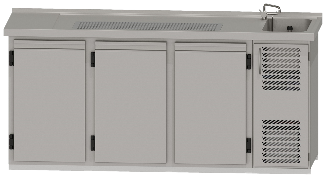 Die Türfront aus Edelstahl 1.4301 sowie der Kühlkorpus aus Chromnickelstahl CNS 18/10 garantieren hervorragende Stabilität und einfache Reinigung. Rückwand, Boden und Seitenteile bestehen aus verzinktem Stahlblech, wodurch die Getränketheke zusätzlich korrosionsgeschützt ist. Der Innenboden ist verstärkt und glatt, um höchste Hygienestandards zu erfüllen. Der umlaufende Aluminium-Sockel (40 × 20 × 2 mm) sorgt für Stabilität und modernes Design.