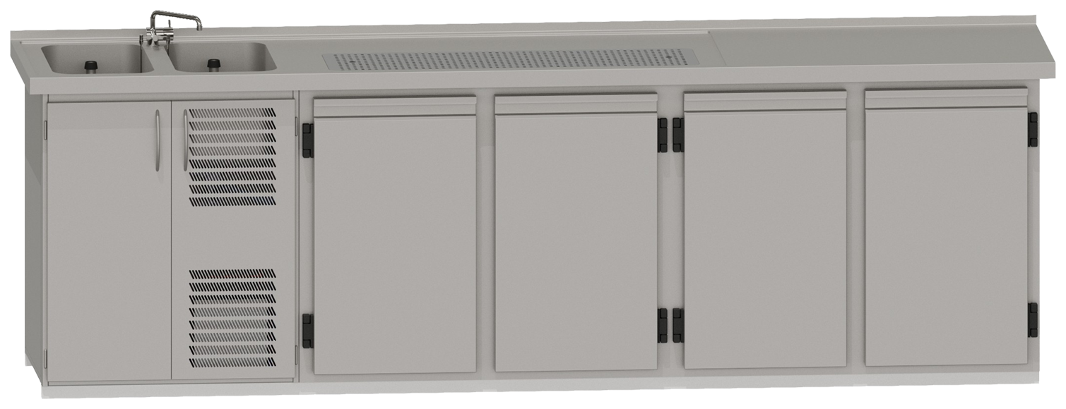 Die im Lieferumfang enthaltene Getränkethekenabdeckung aus Edelstahl 1.4301, seidenmatt gebürstet, verleiht der Theke ein edles Erscheinungsbild. Die zwei links eingebauten Becken (300 × 500 × 300 mm) verfügt über eine Ablaufverbindung mit Standrohr und Ventil. Die Tropfmulde (1100 × 300 mm) leitet Flüssigkeiten effizient in das Becken ab – ideal für den professionellen Barbetrieb.