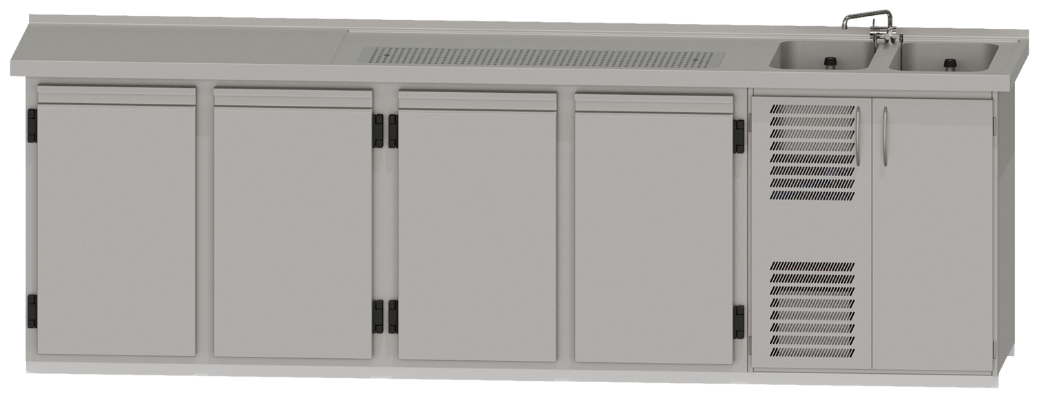 Die Türfront aus Edelstahl 1.4301 sowie der Kühlkorpus aus Chromnickelstahl CNS 18/10 garantieren hervorragende Stabilität und einfache Reinigung. Rückwand, Boden und Seitenteile bestehen aus verzinktem Stahlblech, wodurch die Getränketheke zusätzlich korrosionsgeschützt ist. Der Innenboden ist verstärkt und glatt, um höchste Hygienestandards zu erfüllen. Der umlaufende Aluminium-Sockel (40 × 20 × 2 mm) sorgt für Stabilität und modernes Design.