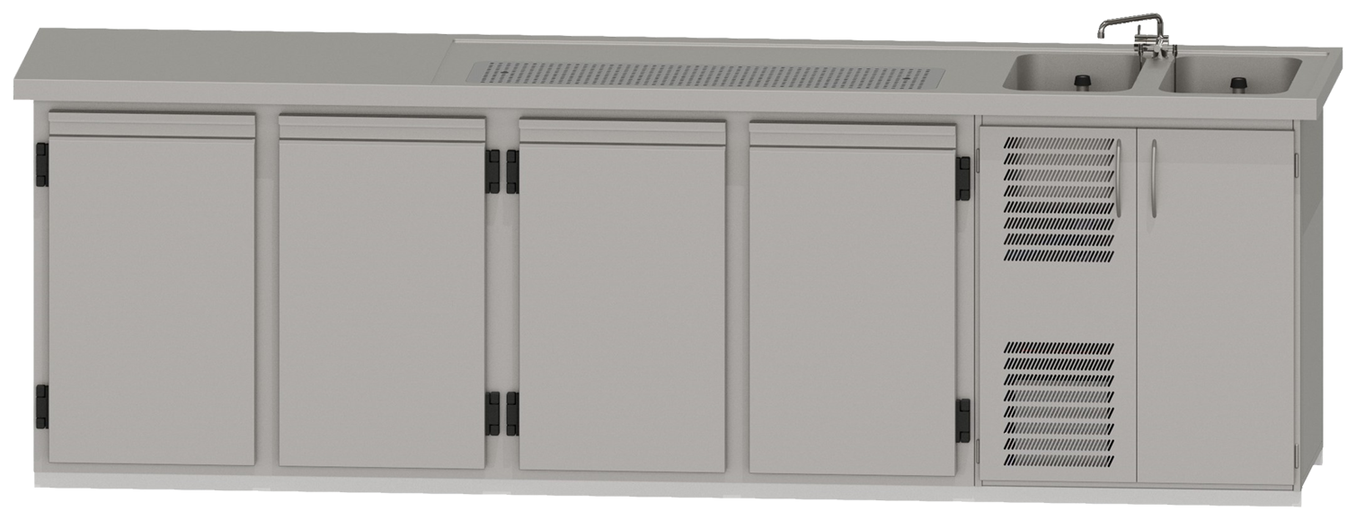 Die Türfront aus Edelstahl 1.4301 sowie der Kühlkorpus aus Chromnickelstahl CNS 18/10 garantieren hervorragende Stabilität und einfache Reinigung. Rückwand, Boden und Seitenteile bestehen aus verzinktem Stahlblech, wodurch die Getränketheke zusätzlich korrosionsgeschützt ist. Der Innenboden ist verstärkt und glatt, um höchste Hygienestandards zu erfüllen. Der umlaufende Aluminium-Sockel (40 × 20 × 2 mm) sorgt für Stabilität und modernes Design.