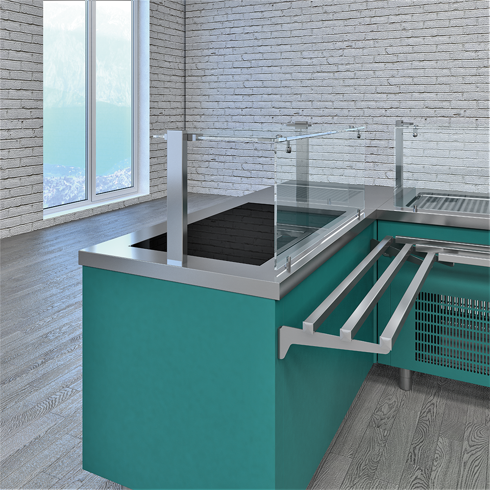 Bain-Marie-Elemente (Wasserbad), Warmhalteplatten, Kühlwannen, Kühlplatten mit stiller Kühlung, Kühlvitrinen (Umluftkühlung), Neutralelemente, Einfahr- und Kassenelemente, Ecklösungen, Warmtellerheber, Tablettrutschen, Hustenschutz mit Glas, LED- und Halogenbeleuchtung sowie Besteckhalter mit Brotausgabe.