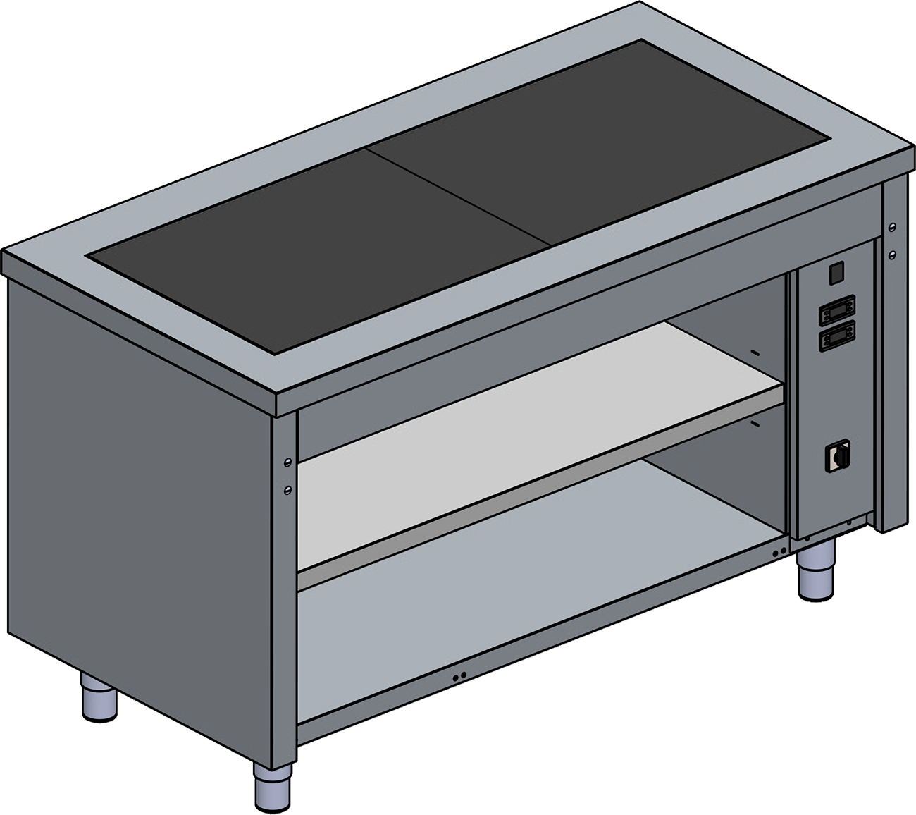 Der Unterbau verfügt über ein bedienerseitiges offenes Schrankfach für zusätzlichen Stauraum. Front und Seiten sind im Edelstahl-Finish ausgeführt und auf langlebigen Edelstahlfüßen positioniert – robust, pflegeleicht und für den professionellen Einsatz konzipiert.