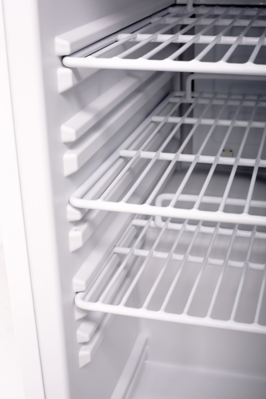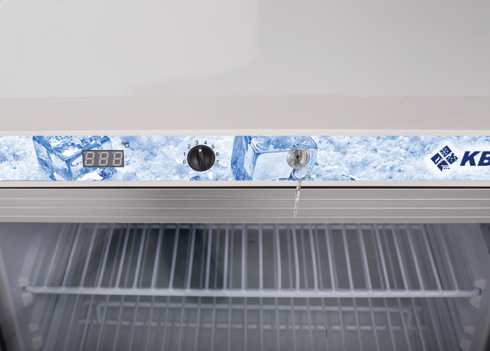 Umluft-Glastürgewerbekühlschrank mit zwangsbelüfteten Kondensator im Maschinenraum sowie großflächigem Rückwandverdampfer. Der fugenlose Kunststoff-Innenbehälter ist leicht zu reinigen. Die vorgeformten Rostauflagen haben einen Abstand von 70 mm, somit können die mitgelieferten Roste bestmöglich dem zu kühlenden Produkt angepasst werden, um eine optimale Raumausnutzung zu erhalten. Für eine optimale Luftführung im Kühlschrank befindet sich im Bodenbereich hinter jeder Tür ein zusätzlicher Rost. Die Glastür ist abschließbar und der Aluminiumrahmen mit einer Magnetsteckdichtung versehen, somit servicefreundlich und ohne Werkzeug wechselbar. Der massive Stangengriff und die Halter für den Wandabstand liegen dem Gerät bei. Das manuelle Thermostat, der Ein-/Ausschalter für die Beleuchtung sowie die digitale Temperaturanzeige sind in der Frontblende integriert. Vorn 2 höhenverstellbare Füße, hinten 2 Rollen. Werkseitig wird der Kühlschrank mit einem rechten Türanschlag ausgeliefert. Auf Wunsch und gegen Mehrpreis ist ein Türanschlagwechsel auf links durch KBS möglich.