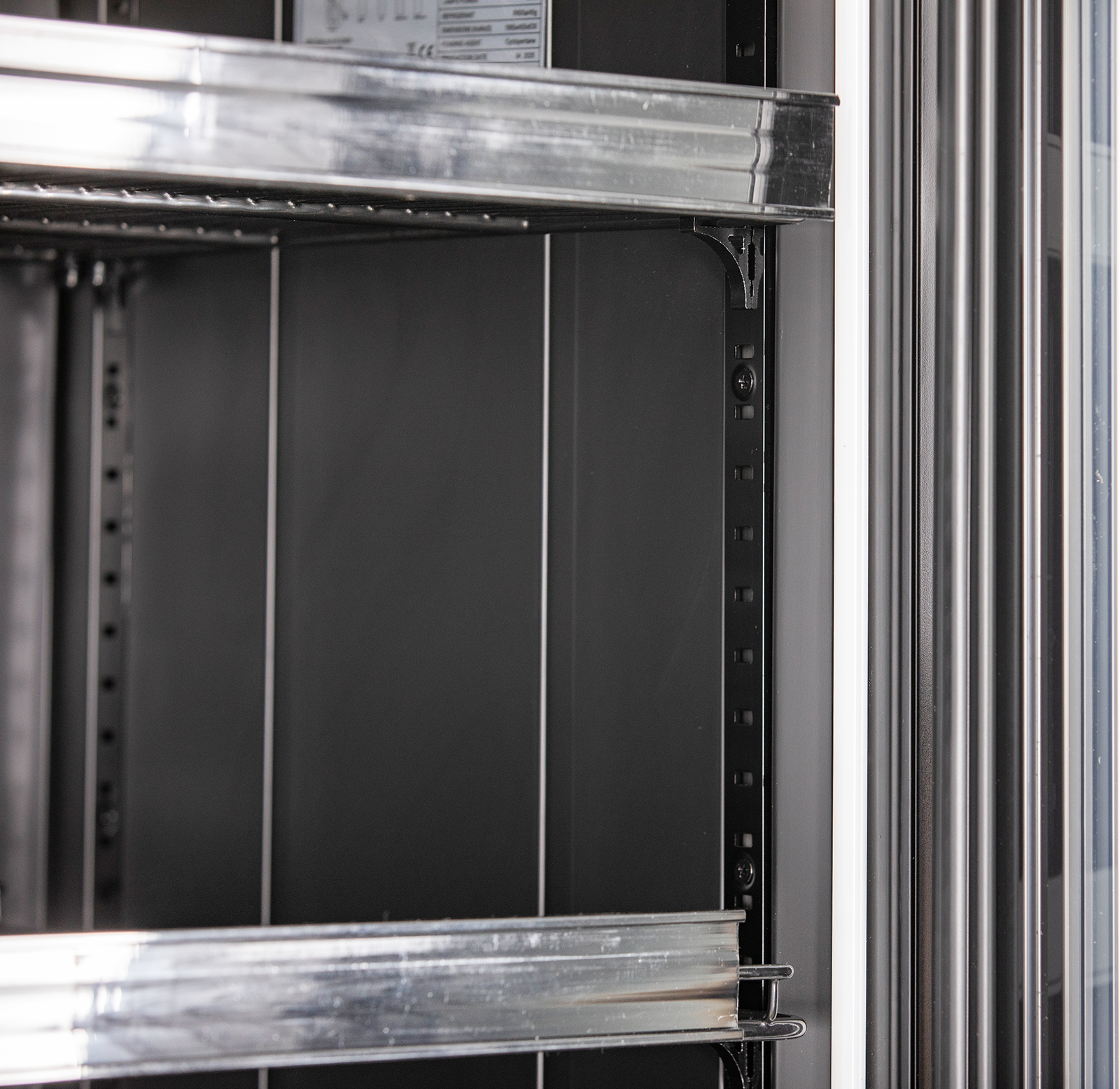 Der Innenraum aus schwarzem Kunststoff ist nicht nur optisch ansprechend, sondern auch besonders leicht zu reinigen. Mit den 5 höhenverstellbaren Rosten mit Preisschienen und 1 zusätzlichen Bodenrost lässt sich der Stauraum individuell an Ihre Bedürfnisse anpassen. Zudem sorgen die vier höhenverstellbaren Ausgleichsfüße für einen sicheren Stand, selbst auf unebenen Böden.