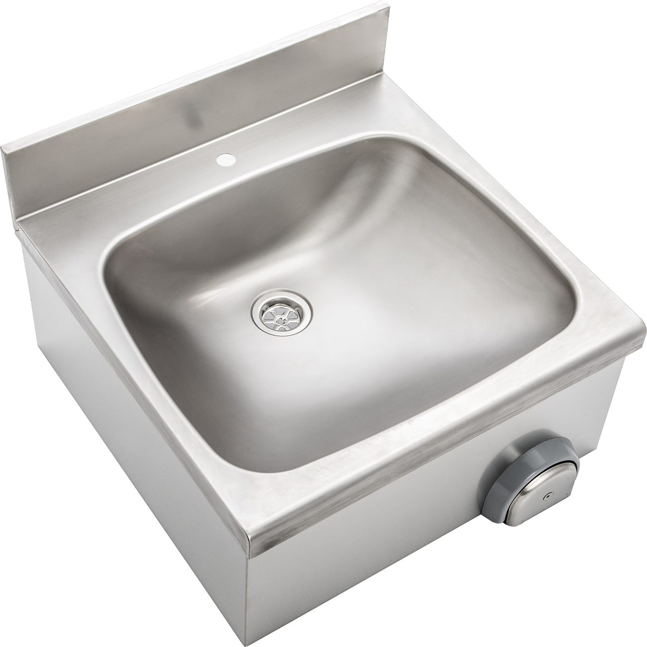 Handwaschbecken aus Edelstahl gefertigt mit Aufkantung, Breite 50cm, Tiefe 50cm in eckiger Form mit ovalem Becken für Wandmontage. Wasserhahn mit mechanischem Timer 7 Sekunden zeitgesteuert.