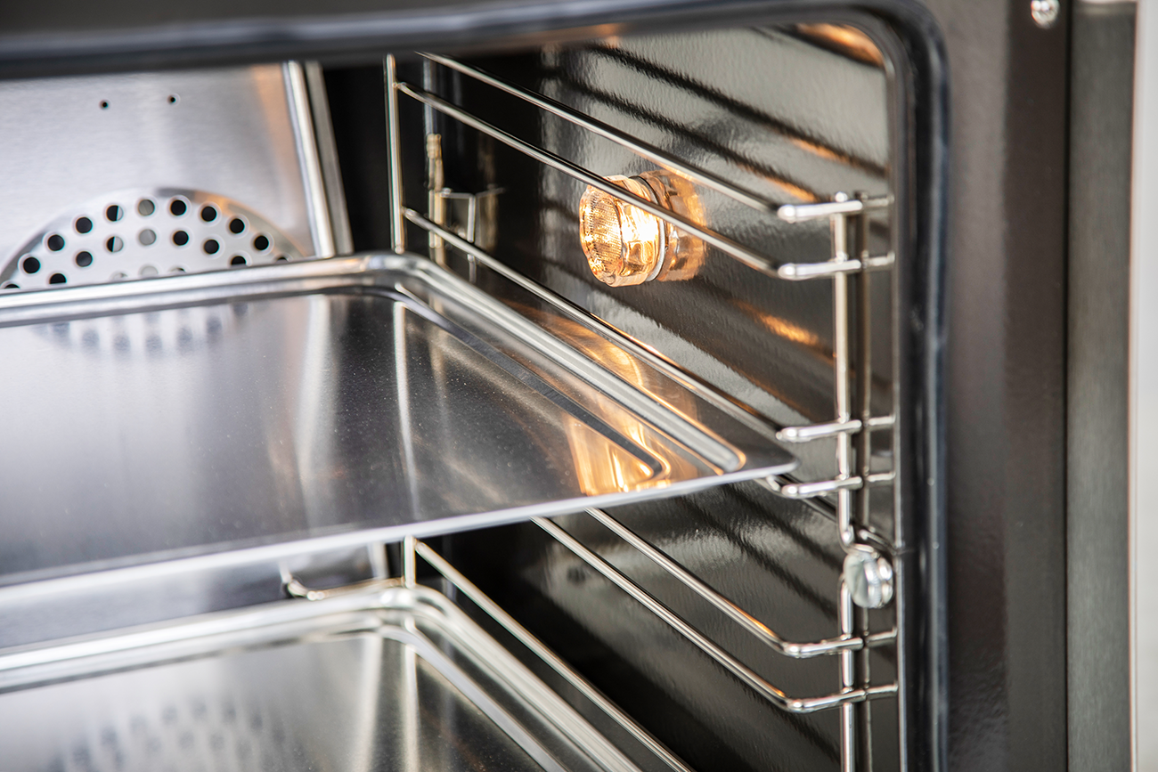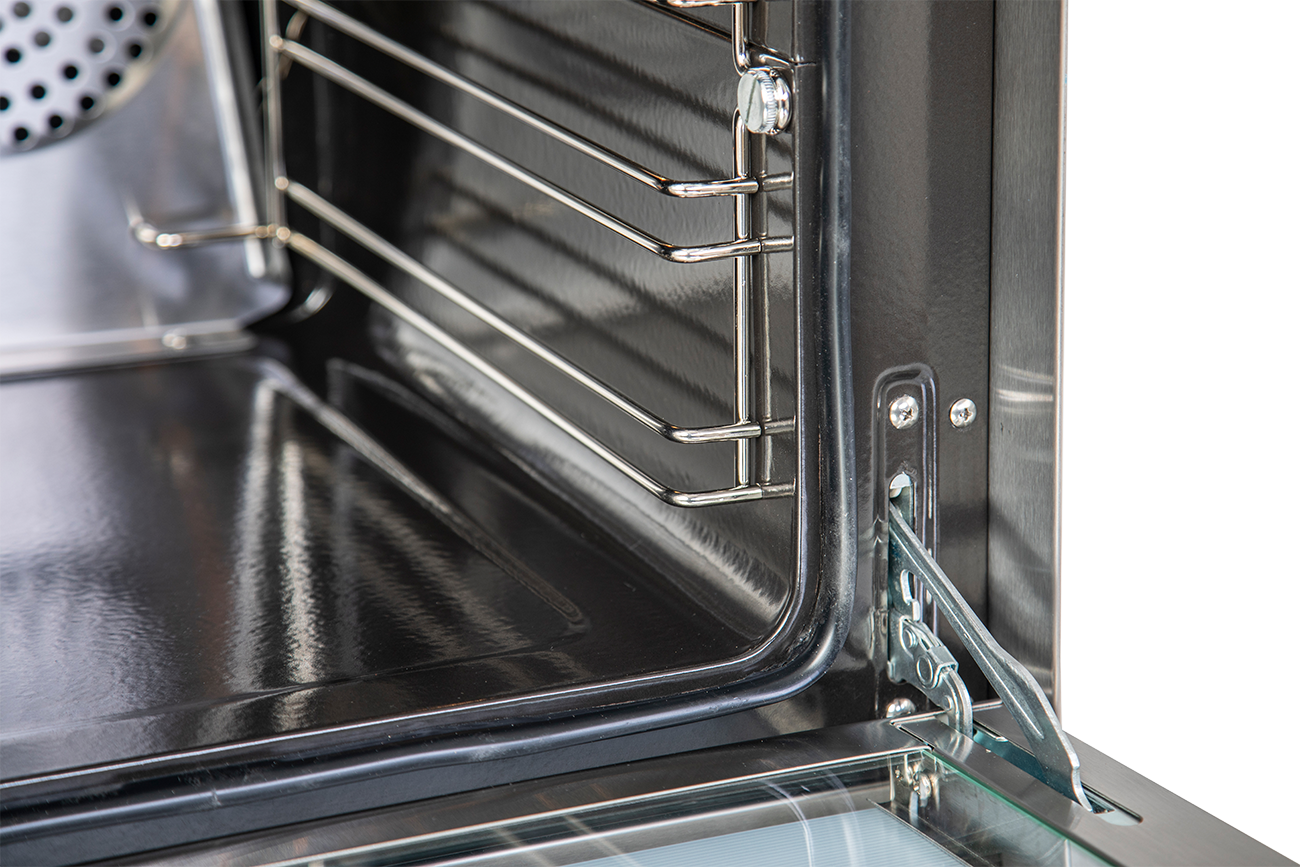 Edelstahl Heißluftofen mit Umluftbetrieb und 2 Heizelementen. Großer Garraum (BxTxH) 460x375x360 mm zur Aufnahme von 4 Blechen/Rosten bis (BxT) 430x320 mm bei einem Abstand von 70 mm zueinander. Emaillierte und abgerundete Backkammer für optimale Reinigung. Elektromechanische Steuerung mit digitaler Zeitanzeige mit Timerfunktion bis 120 Minuten und einem Temperaturbereich bis +300°C einstellbar. Thermoglastür mit schwarzen Rand und aufgesetzten Chrom-Stangengriff für leichtes Öffnen und Schließen.