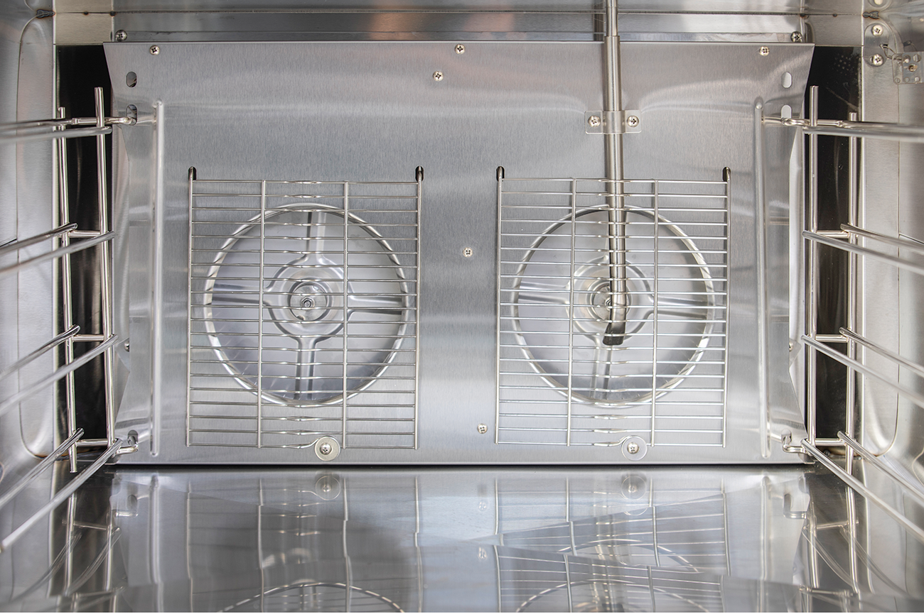 Edelstahl Heißluftofen mit Umluft und manueller Beschwadung (Dampf wird in den Innenraum des Garraum geführt, damit bsp. bei Herstellung von Brot und Gebäck die Teiglinge feucht bleiben) und 2 Heizelementen. Reversierender Motorenlauf (rechts/links) für ein optimales Klima im Garraum. Großer Garraum (BxTxH) 700x420x460 mm zur Aufnahme von 4 Backblechen/Euronorm Blechen 600x400 mm bei einem Abstand von 80 mm zueinander. Edelstahl Backkammer mit gerundeten Innenecken für eine optimale Reinigung. Elektromechanische Steuerung mit digitaler Zeitanzeige mit Timerfunktion bis 105Minuten oder unendlich und einem Temperaturbereich bis +300°C einstellbar. Thermoglastür doppelt Isoliert mit schwarzen Rand und aufgesetzten Chrom-Stangengriff für leichtes Öffnen und Schließen. Wasseranschluß ¾“ für Beschwadung.