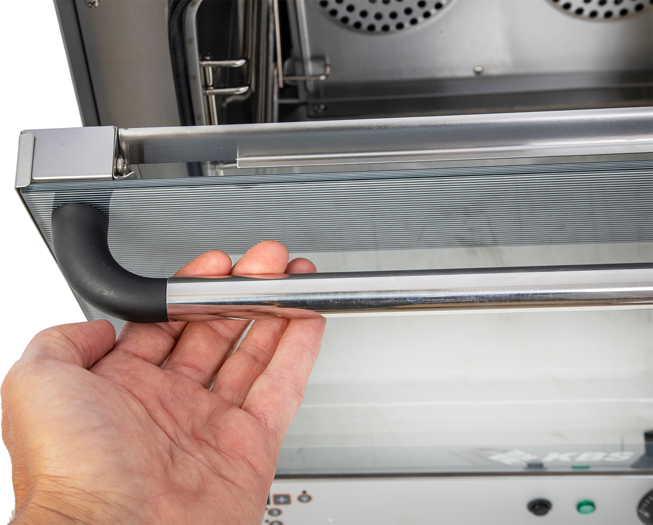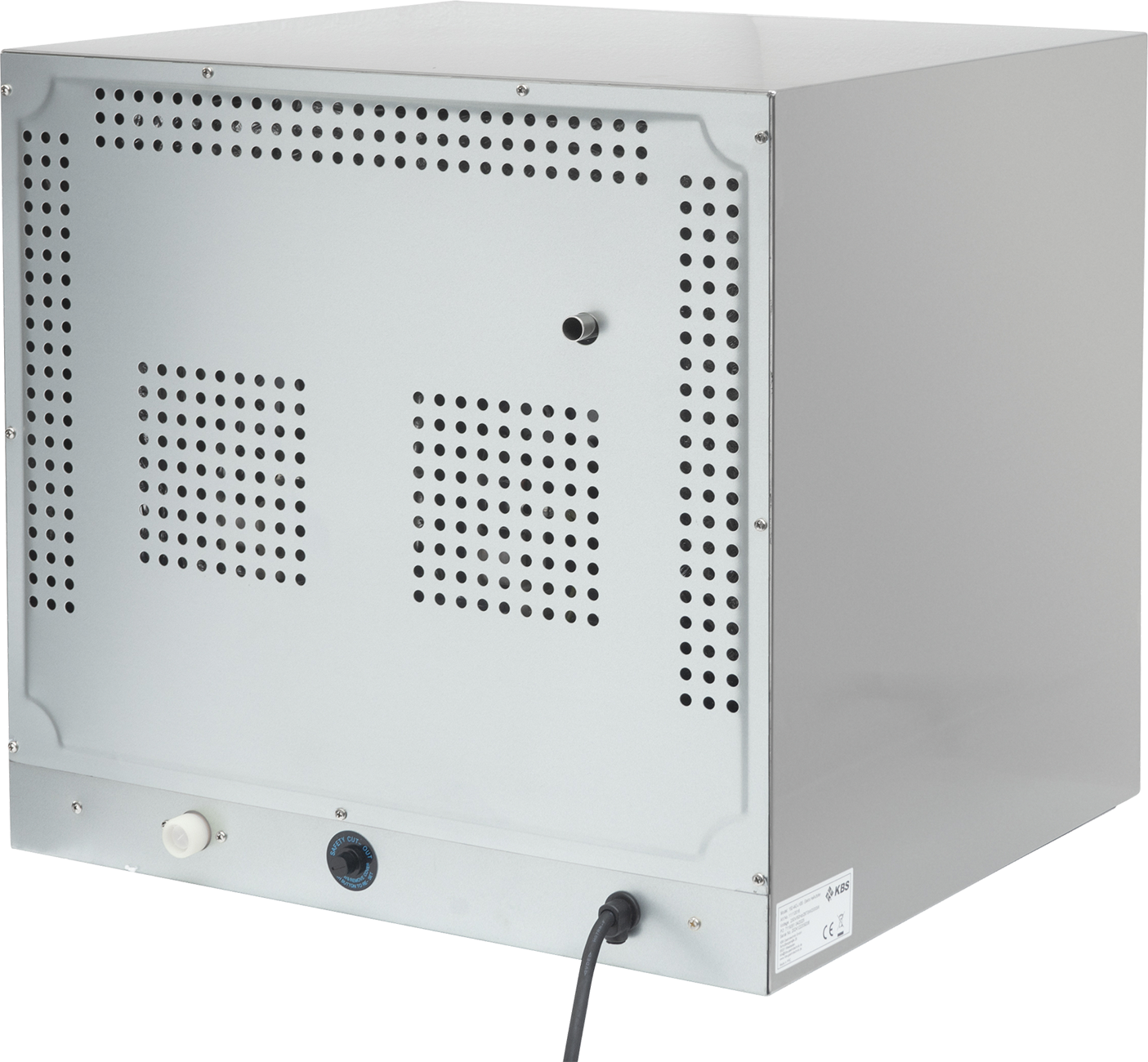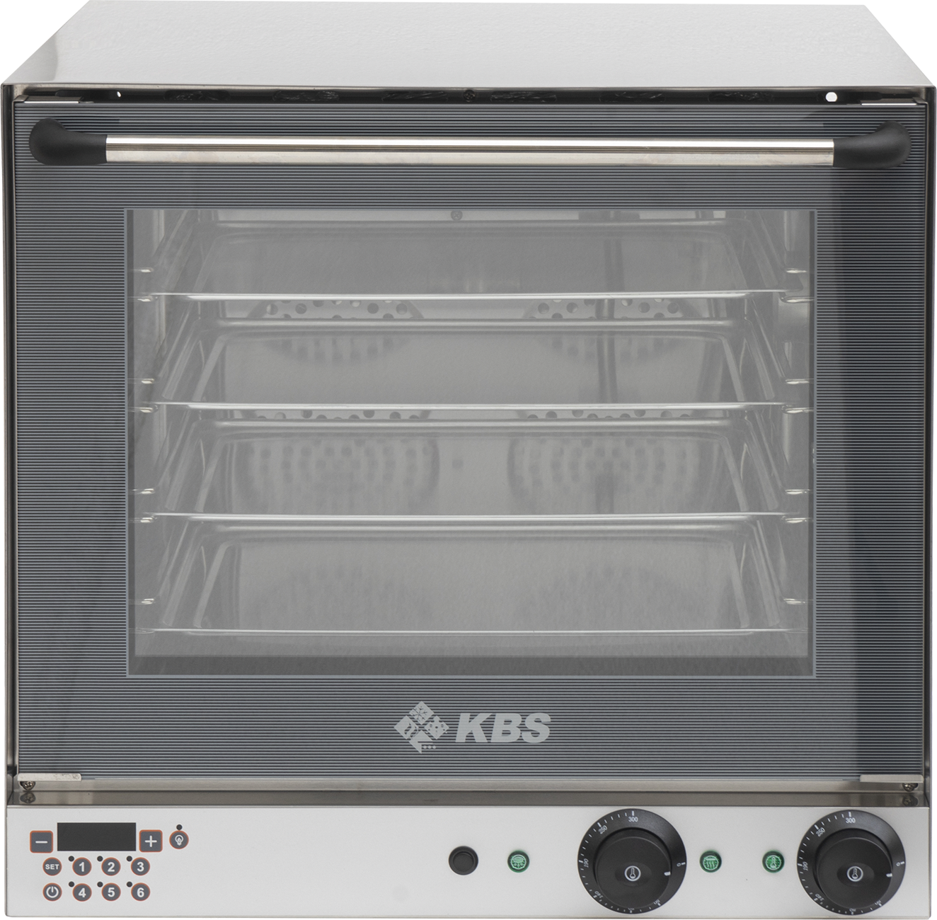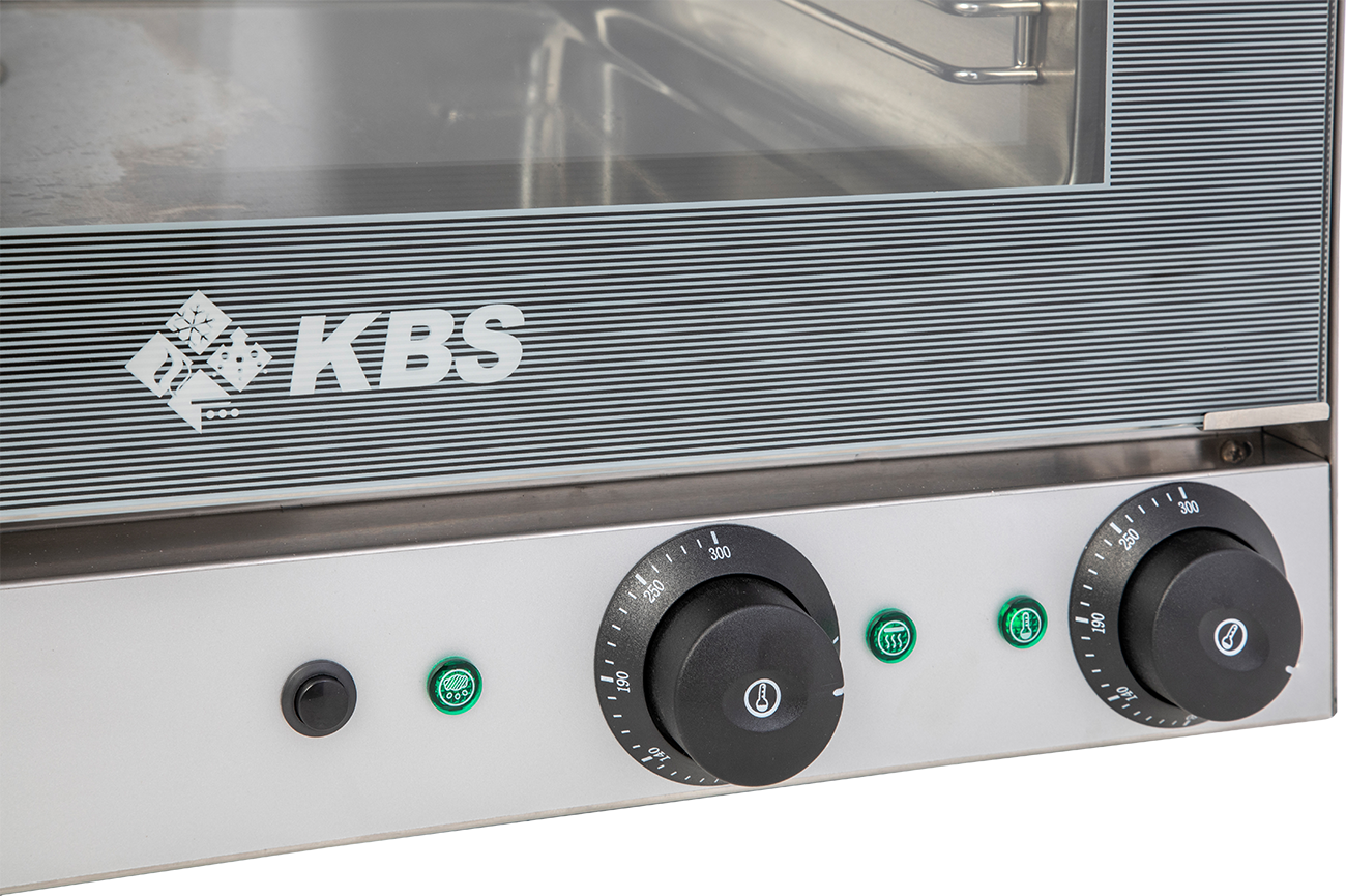 Edelstahl Heißluftofen mit Umluft und manueller Beschwadung (Dampf wird in den Innenraum des Garraum geführt, damit bsp. bei Herstellung von Brot und Gebäck die Teiglinge feucht bleiben) und 3 Heizelementen. Separat schaltbare Grillfunktion mit 2 kW Leistung.Großer Garraum (BxTxH) 460x375x360 mm zur Aufnahme von 4 Blechen/Rosten bis (BxT) 430x320 mm bei einem Abstand von 70 mm zueinander. Abgerundete Backkammer aus Edelstah für optimale Reinigung. Elektromechanische Steuerung mit digitaler Zeitanzeige mit Timerfunktion bis 120 Minuten und einem Temperaturbereich bis +300°C einstellbar. Thermoglastür doppelt Isoliert mit schwarzen Rand und aufgesetzten Chrom-Stangengriff für leichtes Öffnen und Schließen. Wasseranschluß ¾“ für Beschwadung.