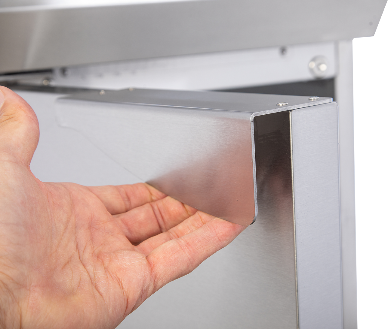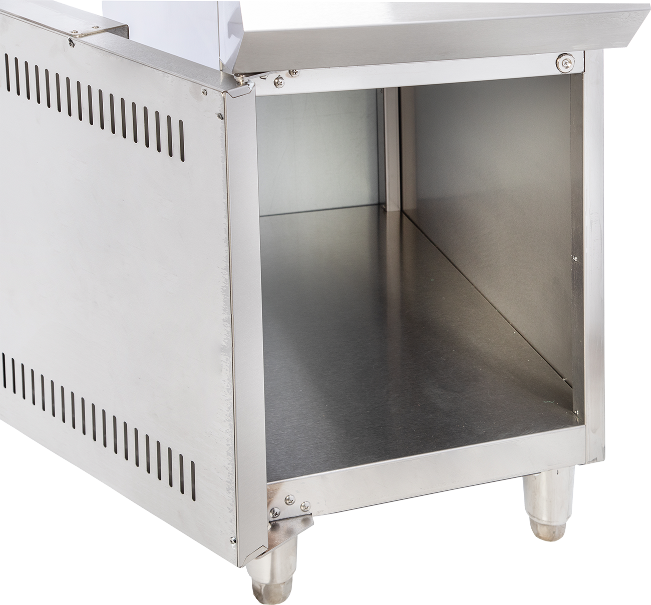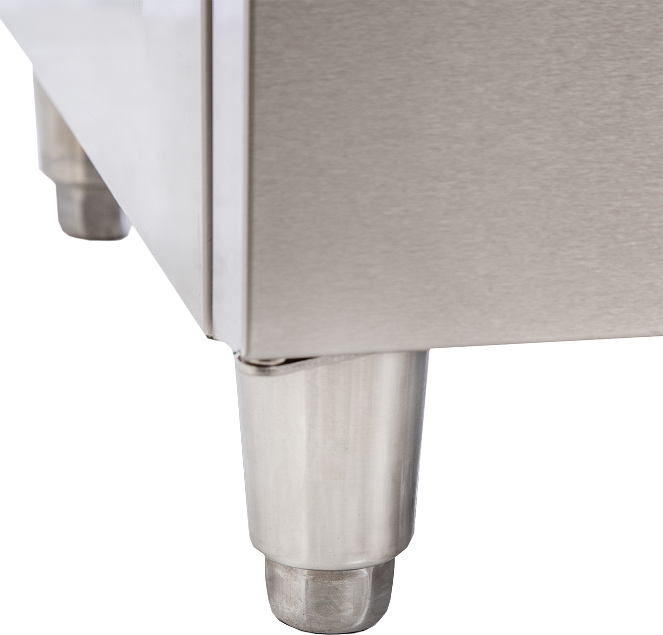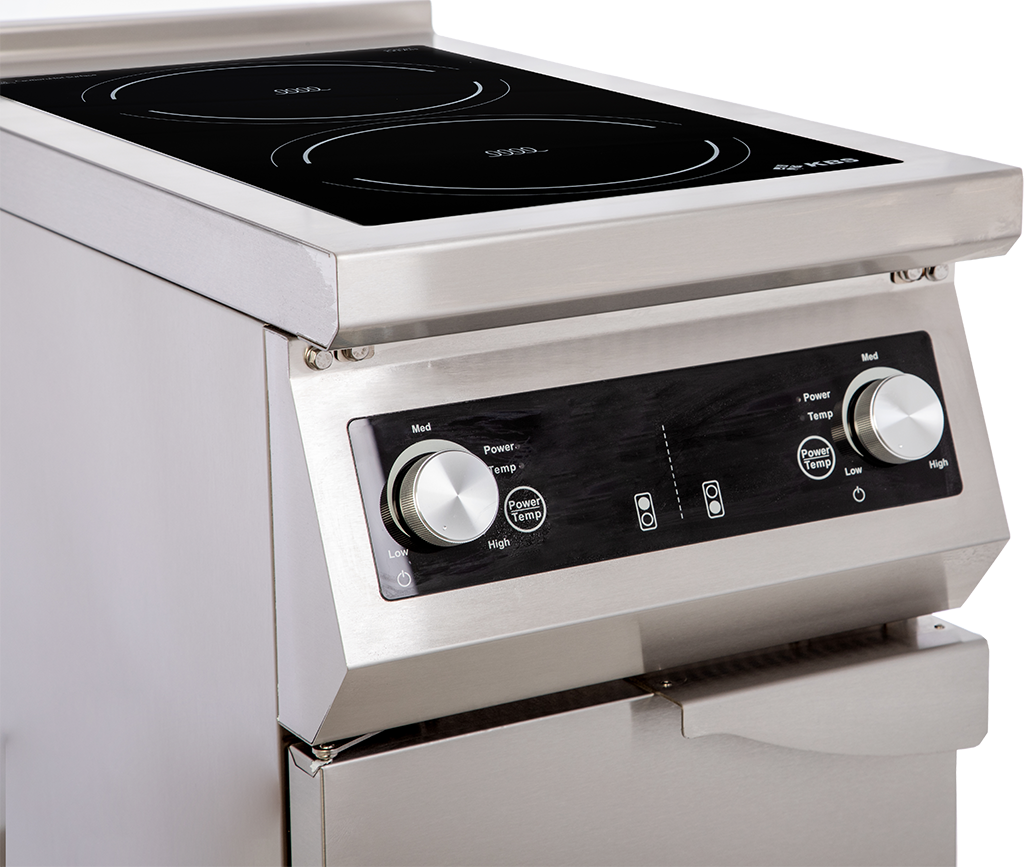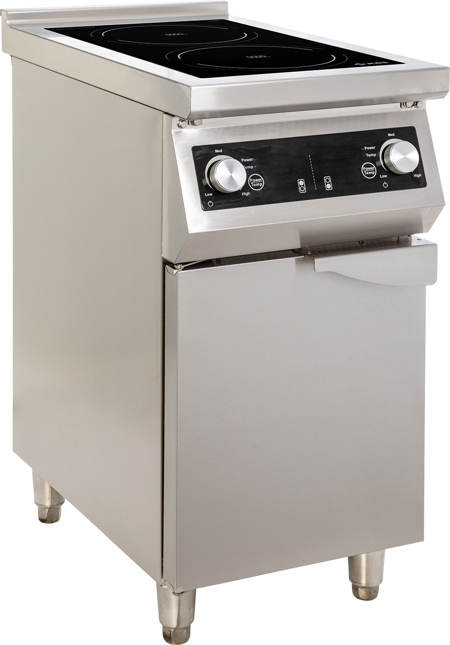Elektro Induktionsherd mit Glaskeramik-Induktionskochfeld und 2 Hochleistungszonen je 5 kW. Touch- und Drehknopfsteuerung mit Topferkennung und Überhitzungsschutz. Größte Kochstelle Ø 260mm, kleinste Kochstelle Ø 660mm . Unterbau mit Flügeltür und höhenverstellbaren Ausgleichsfüßen.