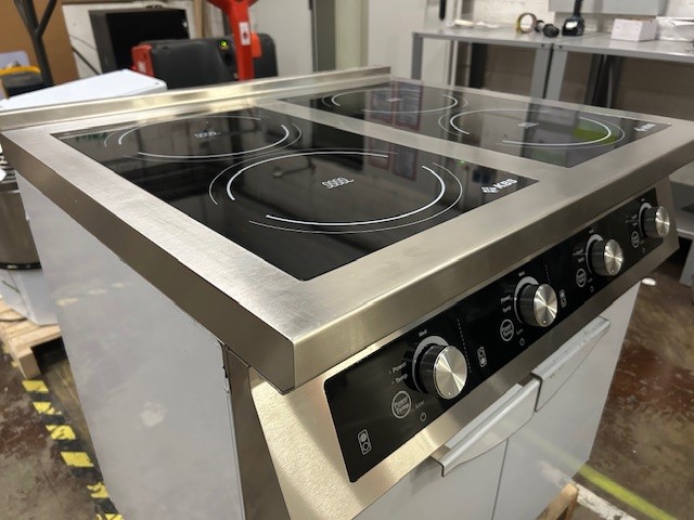 Elektro Induktionsherd mit Glaskeramik-Induktionskochfeld und 2 Hochleistungszonen je 5 kW. Touch- und Drehknopfsteuerung mit Topferkennung und Überhitzungsschutz. Größte Kochstelle Ø 260mm, kleinste Kochstelle Ø 660mm . Unterbau mit Flügeltür und höhenverstellbaren Ausgleichsfüßen.