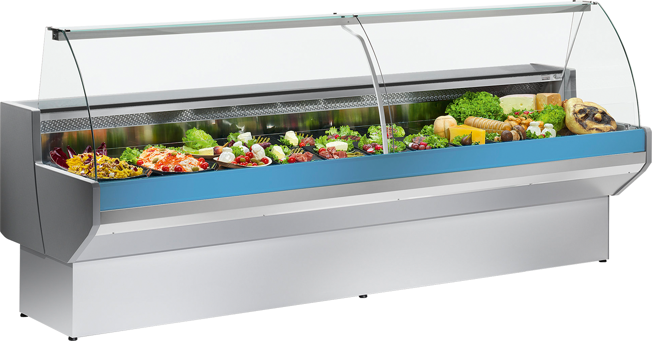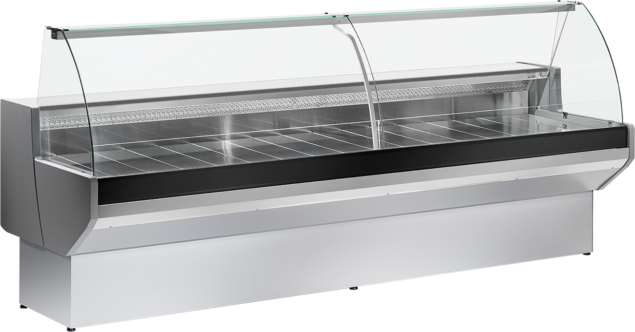 Kühltheke Pablo 3 mit stiller Kühlung und Frontblende aus elegantem Edelstahl Scotch Brite I 301 gefertigt. Gebogener Glasaufbau aus Sicherheitsglas mit einer gebogenen Frontscheibe und Rückschiebescheiben. Die Kühltheke Pablo verfügt über eine elektronische Steuerung mit digitaler Temperaturanzeige und einer separat schaltbaren energiesparenden LED - Auslagenbeleuchtung. Die Ausstellungsfläche gefertigt aus Edelstahl CNS 18/10 (Chromnickelstahl (AISI 304) bietet mit einer Tiefe von 640 mm ausreichend Platz. Zusätzlicher Stauraum bietet die Kühltheke über ein gekühltes Reservefach, welches über Türen zugänglich ist und eine maximale Tiefe von 560 mm hat. Die Höhe der Einbringöffnung in den Türen beträgt 220 mm. Im Bedienbereich verfügt die Kühltheke über eine Edelstahlarbeitsplatte mit einerTiefe von 280 mm. Der Verdampfer der Kühltheke ist natürlich für eine lange Lebensdauer beschichtet. Die Abtauung der Kühltheke erfolgt automatisch, dabei wird das Tauwasser in der beiliegenden Tauwasserschale für die bauseitige Entsorgung aufgefangen. Weiterhin verfügt die Kühltheke über höhenverstellbare Ausgleichsfüße um Bodenunebenheiten vor Ort auszugleichen. Die Frischwarenkühltheke ist mit einer Frontblende in Scotch Brite I 301 versehen. Die untere Frontblende ist in grau lackiert, die Seitenteile und Stoßleiste in Kunststoff und grau gefertigt damit bietet diese Theke einen vielfältigen Einsatzsatzbereich auch im Ladenbau.