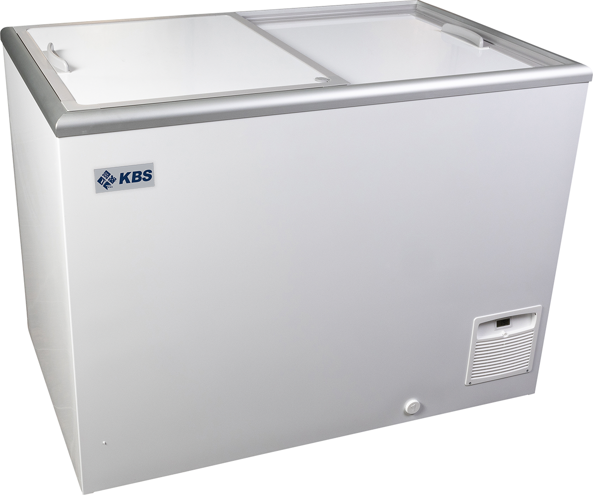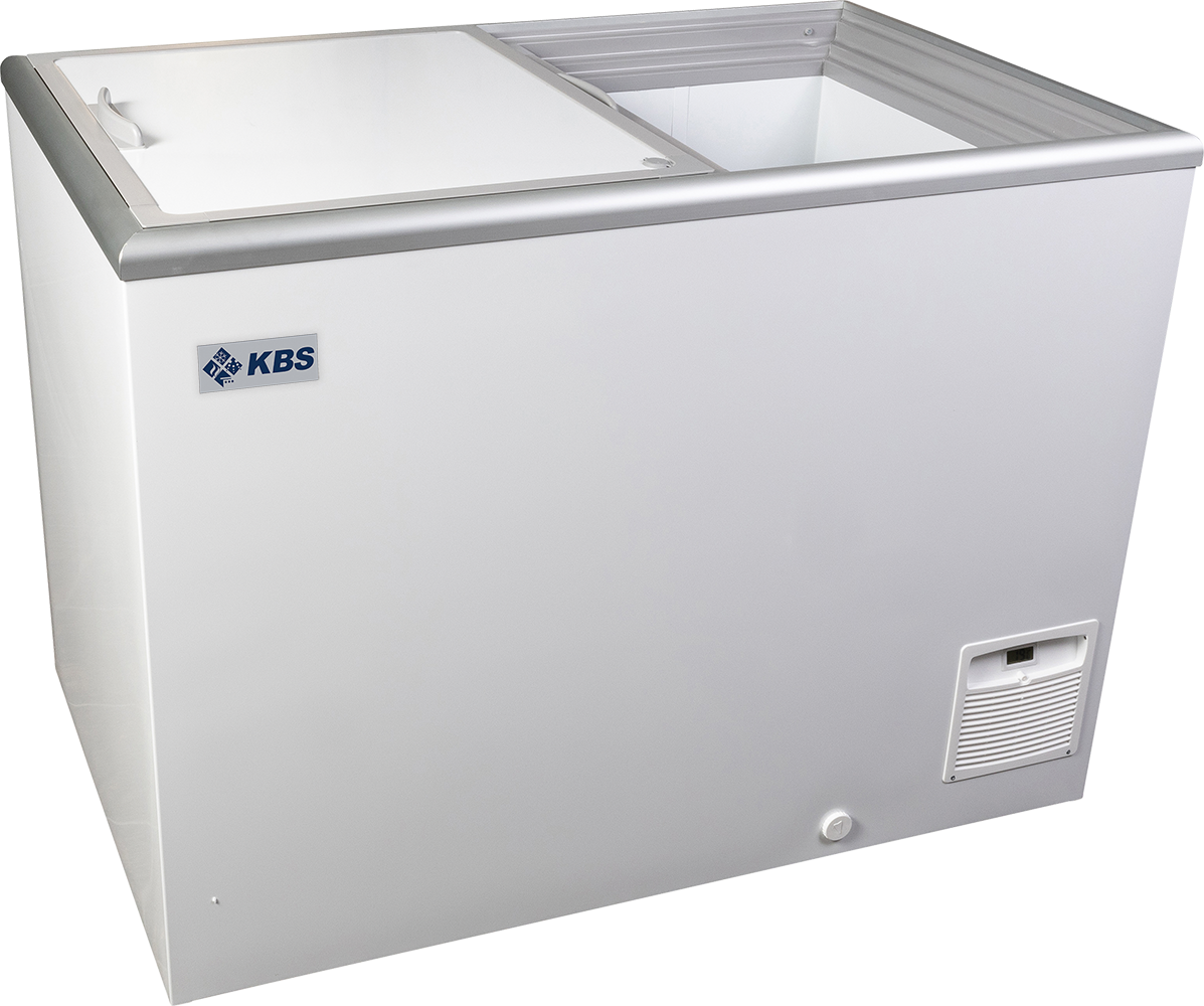 KBS Tiefkühltruhe mit zwei Schiebetüren in geschlossenem Zustand. Ansicht von oben, zeigt klare Linienführung des Gehäuses.