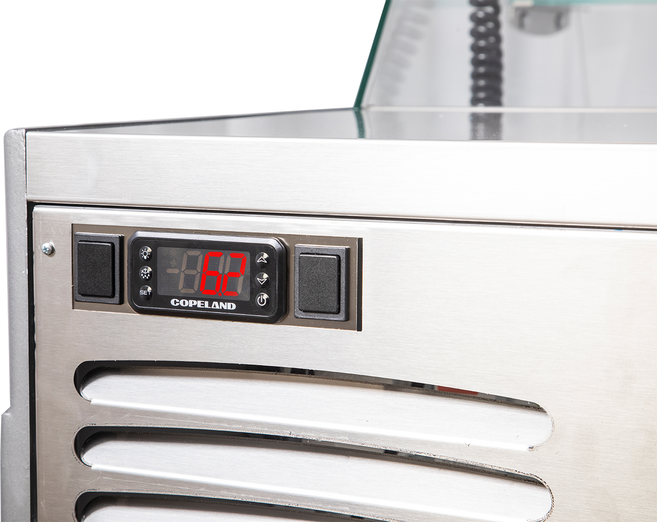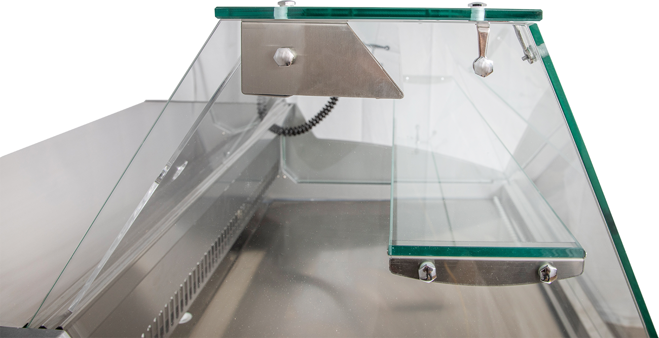 Kühlvitrine mit geradem Glasaufbau der Serie Super. Die Mehrzweck-Kühlvitrine verfügt über eine elektronische Steuerung und eine digitale Temperaturanzeige. Die Beleuchtung der Kühlvitrine ist separat schaltbar. Das Aggregat befindet sich unter dem 380 mm tiefen Schneidbrett, damit lässt sich die Kühlvitrine problemlos auf ebenen Flächen abstellen, einen Ausschnitt in eine Arbeitsfläche ist für diese Kühlvitrine nicht nötig. Beschichteter Verdampfer mit Verdampferabdeckung aus CNS. Die LED-Temperaturanzeige befindet sich in der Ausstellungsfläche. Der Glasaufbau der Kühlvitrine besteht aus Sicherheitsglas. Die Seitenteile (Granitgrau) RAL 7026. Das Fahrgestell der Kühlvitrine ist nicht im Lieferumfang enthalten, kann aber separat bestellt werden. Die angegebene Temperatur ist nur für die Auslagefläche maßgebend